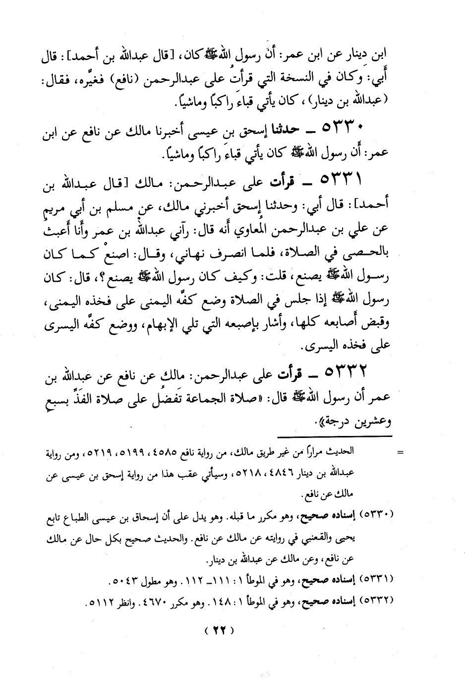 5332 - قرأت على عبد الرحمن: مالك عن نافع عن عبد الله بن عمر أن رسول الله -صلي الله عليه وسلم- قال: "صلاة الجماعة تَفضُل على صلاة الفَذِّ بسبعٍ وعشرين درجة".