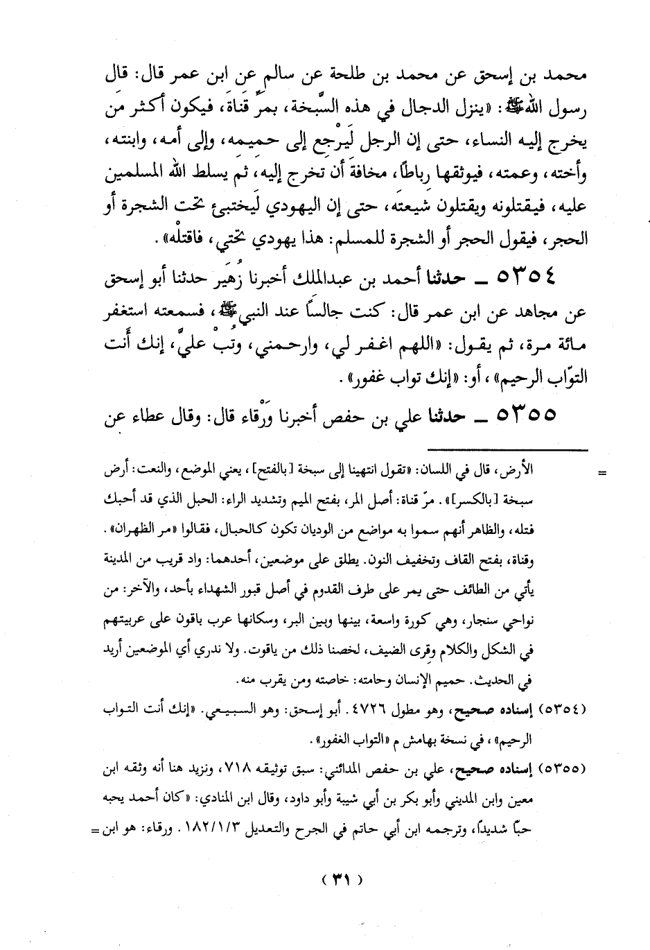 محمد بن إسحق عن محمد بن طلحة عن سالم عن ابن عمر قال: قال رسول الله -صلي الله عليه وسلم-: "ينزل الدجال في هذه السَّبخة، بمر قَناةَ، فيكون أكثر من يخرج إليه النساء، حتى إن الرجل لَيرْجِع إلى حميمِه، وإلى أمه، وابنته، وأخته، وعمته، فيوثقها رِباطاً، مخافةَ أن تخرج إليه، ثم يسلط الله المسلمين عليه، فيقتلونه ويقتلون شيعتَه، حتى إن اليهودي لَيختبئ تحت الشجرة أو الحجر، فيقول الحجر أو الشجرة للمسلم: هذا يهودي تحتي، فاقتلْه".