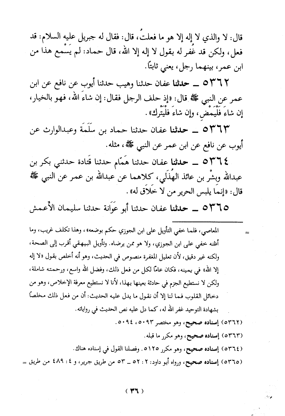 5363 - حدثنا عفان حدثنا حماد بن سَلَمَة وعبد الوارث عن أيوب عن نافع عن ابن عمر عن النبي -صلي الله عليه وسلم-، مثله.