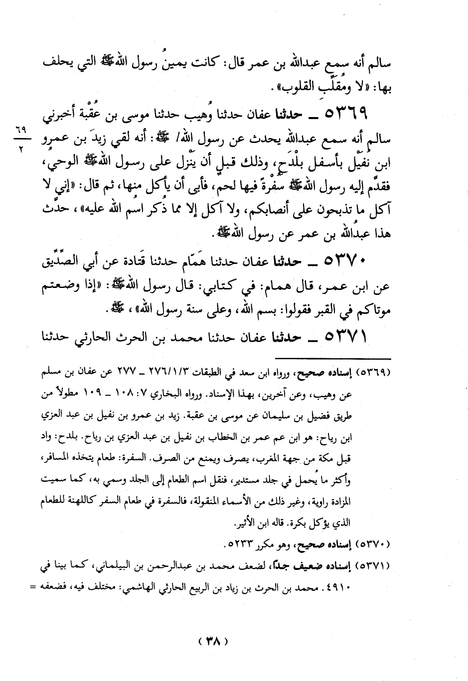 (5369) إسناده صحيح، ورواه ابن سعد في الطبقات 3/ 1/276 - 277 عن عفان بن مسلم عن وهيب، وعن آخرين، بهذا الإسناد. ورواه البخاري 7: 108 - 109 مطولاً من طريق فضيل بن سليمان عن موسى بن عقبة. زيد بن عمرو بن نفيل بن عبد العزي ابن رياح: هو ابن عم عمر بن الخطاب بن نفيل بن عبد العزي بن رياح. بلدح: واد قبل مكة من جهة المغرب، يصرف ويمنع من الصرف. السفرة: طعام يتخذه المسافر، وأكثر ما يُحمل في جلد مستدير، فنقل اسم الطعام إلى الجلد وسمي به، كما سميت المزادة راوية، وغير ذلك من الأسماء المنقولة، فالسفرة في طعام السفر كاللهنة للطعام الذي يؤكل بكرة. قاله ابن الأثير.