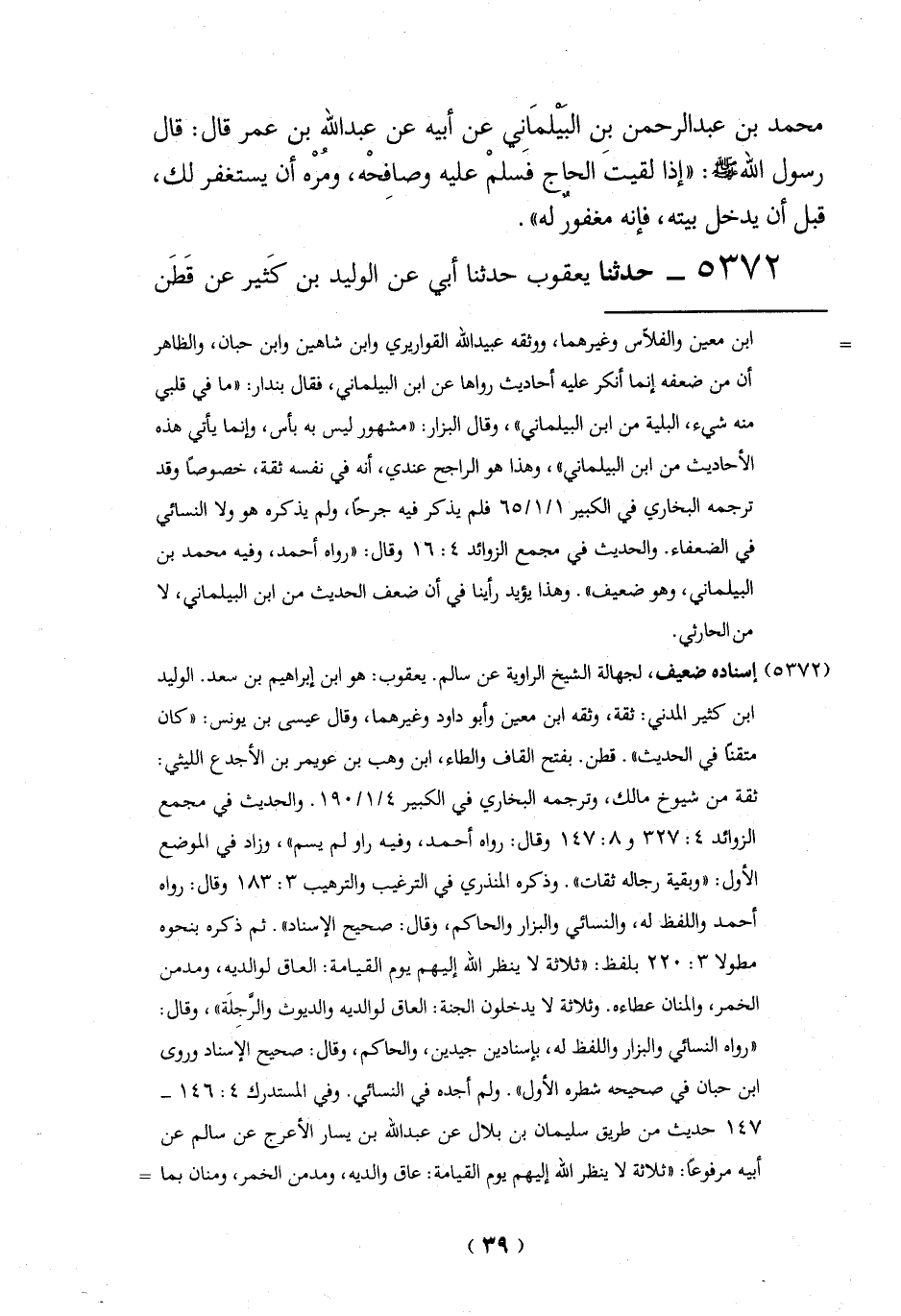 محمد بن عبد الرحمن بن البَيْلمَانِي عن أبيه عن عبد الله بن عمر قال: قال رسول الله -صلي الله عليه وسلم-: "إذا لقيتَ الحاج فسلمْ عليه وصافحْه، ومُرْه أن يستغفر لك، قبل أن يدخل بيته، فإنه مغفورٌ له".