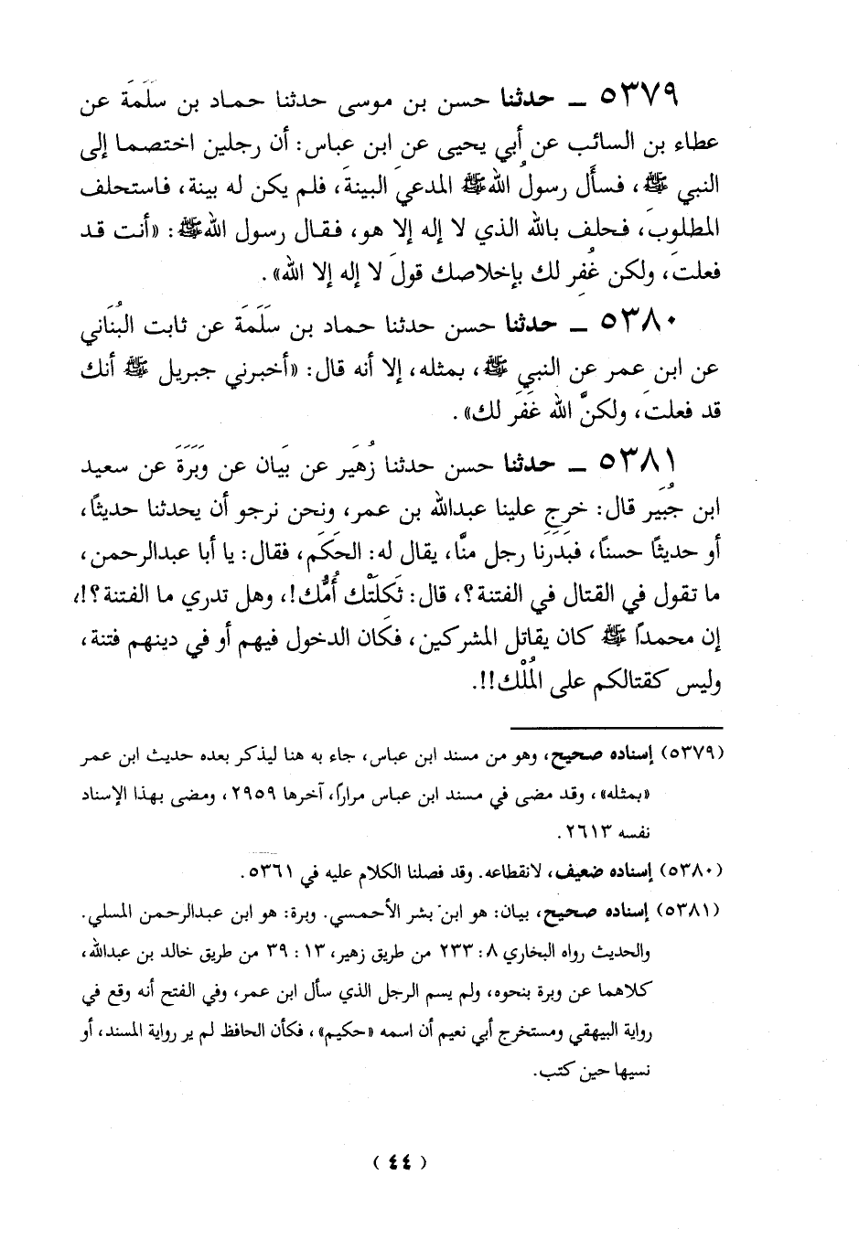 5381 - حدثنا حسن حدثنا زُهَير عن بَيان عن وَبَرَةَ عن سعيد ابن جُبَير قال: خرج علينا عبد الله بن عمر، ونحن نرجو أن يحدثنا حديثاً، أو حديثاً حسناً، فبَدَرَنا رجل منَّا، يقال له: الحَكَم، فقال: يا أبا عبد الرحمن، ما تقول في القتال في الفتنة؟، قال: ثَكِلَتْك أُمُّك!، وهل تدري ما الفتنة؟! , إن محمداً -صلى الله عليه وسلم- كان يقاتل المشركين، فكان الدخول فيهم أو في دينهم فتنة، وليس كقتالكم علي المُلْك!!.