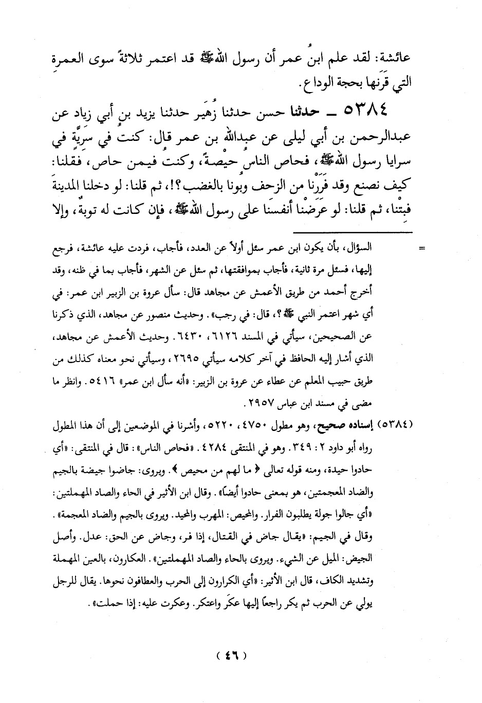 5384 - حدثنا حسن حدثنا زُهَير حدثنا يزيد بني أبي زِياد عن عبد الرحمن بن أبي ليلى عن عبد الله بن عمر قال: كنتُ في سريَّةٍ في سرايا رسول الله -صلي الله عليه وسلم-، فحاص الناس حيْصةً، وكنت فيمن حاص، فقلنا: كيف نصنع وقد فَرَرنا من الزحف وبُونا بالغضب؟!، ثم قلنا: لو دخلنا المدينةَ فبِتْنا، ثم قلنا: لو عَرَضْنا أنفسَنا على رسول الله -صلي الله عليه وسلم-، فإن كانت له توبةٌ، وإلا