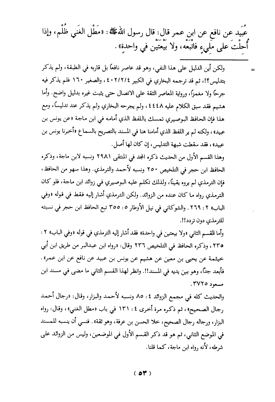 = ولكن أين الدليل على هذا النفي، وهو قد عاصر نافعاً بل قاربه في الطبقة، ولم يذكر بتدليس؟!، ثم قد ترجمه البخاري في الكبير 4/ 2/ 402، والصغير 160 فلم يذكر فيه جرحاً ولا مغمزاً، ورواية المعاصر الثقة على الاتصال حتى يثبت غيره بدليل واضح. وأما هشيم فقد سبق الكلام عليه 4448، ولم يجرحه البخاري ولم يذكر عند تدليساً، ومع هذا فإن الحافظ البوصيري تمسك باللفظ الذي أمامه في ابن ماجة "عن يونس بن عبيد"، ولكنه لم ير اللفظ الذي أمامنا هنا في المسند بالتصريح بالسماع "أخبرنا يونس بن عبيد"، فقد سقطت شبهة التدليس، إن كان لها أصل.