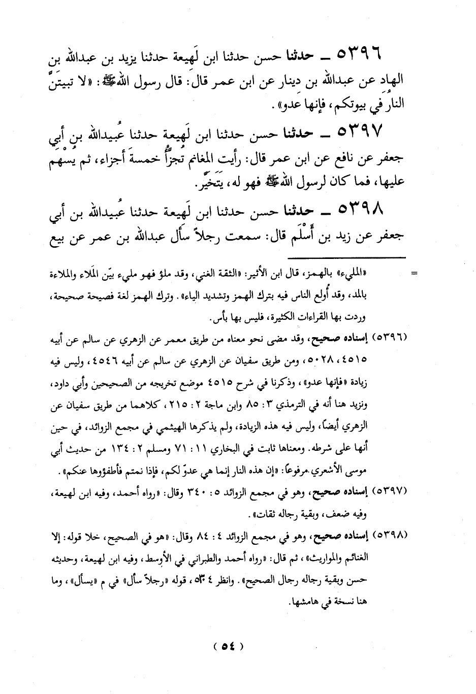 5396 - حدثنا حسن حدثنا ابن لَهِيعة حدثنا يزيد بن عبد الله بِن الهاد عن عبد الله بن دينار عن ابن عمر قال: قال رسول الله -صلي الله عليه وسلم-: "لا تبيتَنَّ النارُ في بيوتكم، فإنها عَدو".