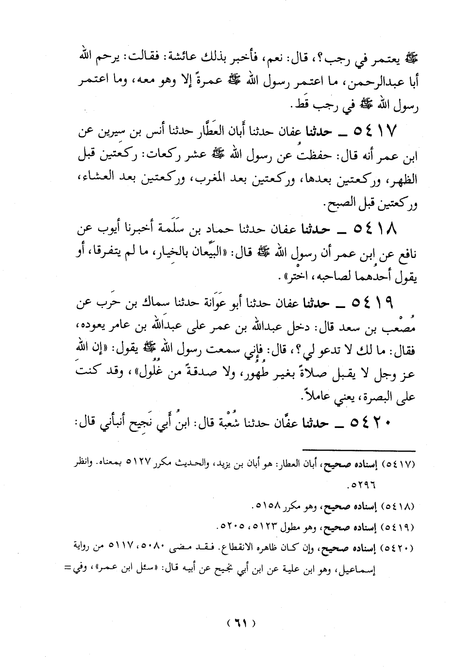 5417 - حدثنا عفان حدثنا أَبان العَطَّار حدثنا أنس بن سيرين عن ابن عمر أنه قال: حفظتُ عن رسول الله-صلي الله عليه وسلم- عشر ركعات: ركعَتين قبل الظهر، وركعتين بعدها، وركعتين بعد المغرب، وركعتين بعد العشاء، وركعتين قبل الصبح.