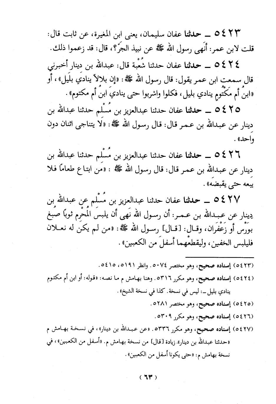 (5424) إسناده صحيح، وهو مكرر 5316. وهنا بهامش م ما نصه: "قوله: أو ابن أم مكتوم ينادي بليل-: ليس في نسخة. كذا في نسخة الشيخ".