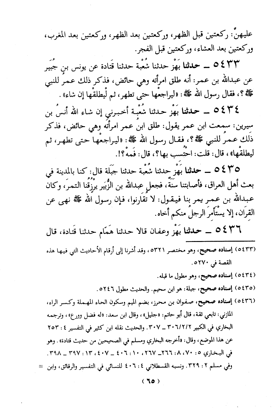 5433 - حدثنا بَهْز حدثنا شُعْبة حدثنا قَتادة عن يونس بني جُبَير عن عبد الله بن عمر: أنه طلق امرأته وهي حائض، فذكر ذلك عمرُ للنبي - صلى الله عليه وسلم -؟، فقال رسول الله -صلي الله عليه وسلم -: "ليراجعْها حتى تطهير، ثم لْيطلقْها إن شاء".