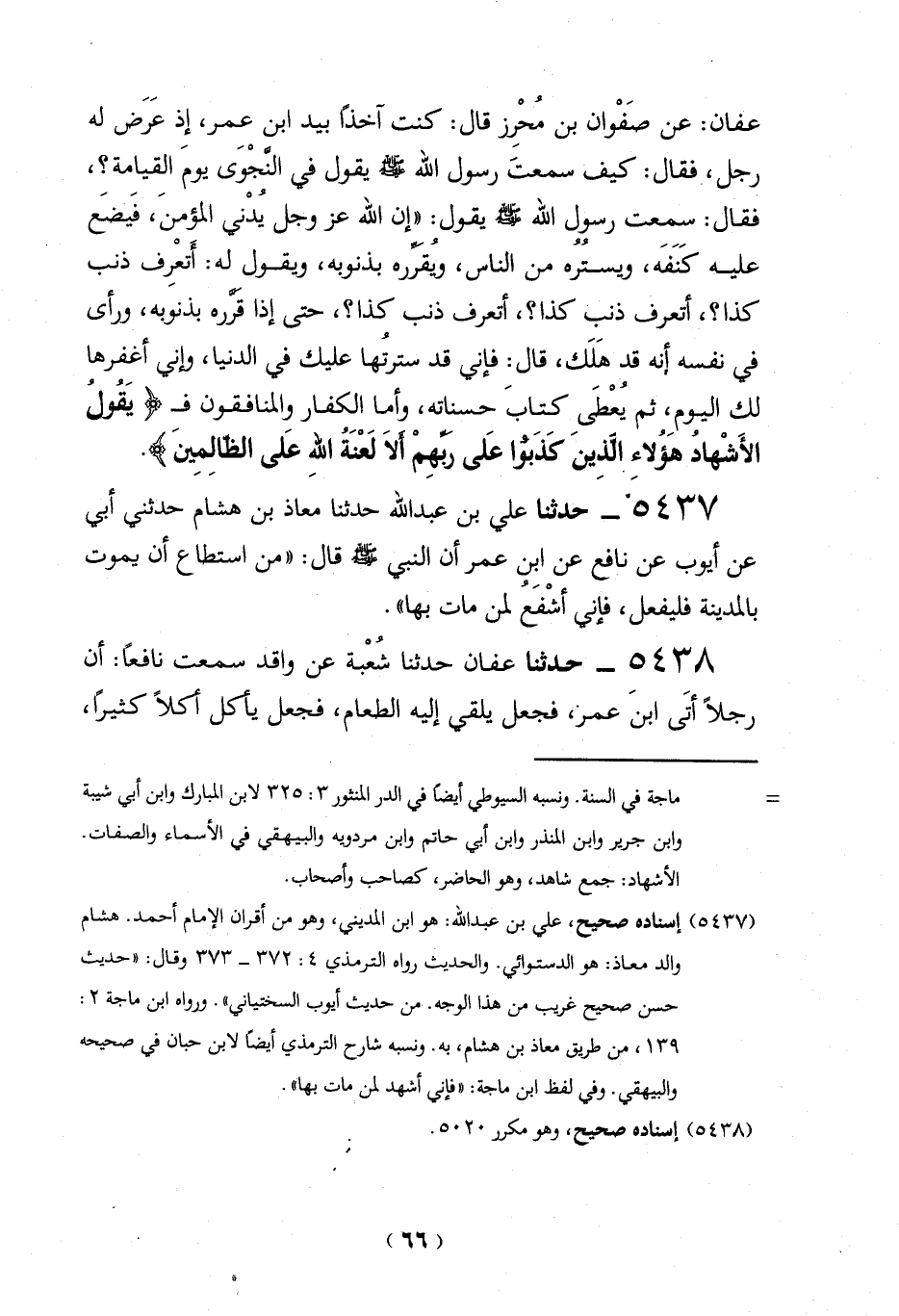 عفان: عن صَفْوان بن مُحْرز قال: كنت آخذاً بيد ابن عمر، إذ عَرَض له رجل، فقال: كيف سمعتَ رسول الله -صلي الله عليه وسلم - يقول في النَّجوَى يومَ القيامة؟، فقال: سمعت رسول الله -صلي الله عليه وسلم - يقول "إن الله عَزَّ وَجَلَّ يُدْني المؤمنَ، فَيضَع عليه كَنَفَه، ويستُرُه من الناس، وُيقَرِّره بذنوبه، ويقول له: أَتعْرِف ذنب كذا؟، أتعرف ذنب كذا؟، أتعرف ذنب كذا؟، حتى إذا قرَّره بذنوبه، ورأى في نفسه أنه قد هَلَك، قال: فإني قد سترتُها عليك في الدنيا، وإني أغفرها لك اليوم، ثم يُعْطي كتابَ حسناته، وأما الكفار والمنافقون في {يَقُولُ الْأَشْهَادُ هَؤُلَاءِ الَّذِينَ كَذَبُوا عَلَى رَبِّهِمْ أَلَا لَعْنَةُ اللَّهِ عَلَى الظَّالِمِينَ (18)}.