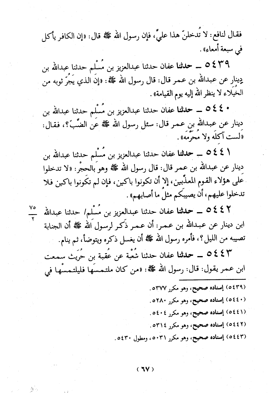 5439 - حدثنا عفان حدثنا عبد العزيز بن مُسْلم حدثناِ عبد الله بن دِينار عن عبد الله بن عمر قال: قال رسول الله -صلي الله عليه وسلم -: "إنَ الذي يجرّ ثوبه من الخيَلاء لا ينظر الله إليه يوم القيامة".