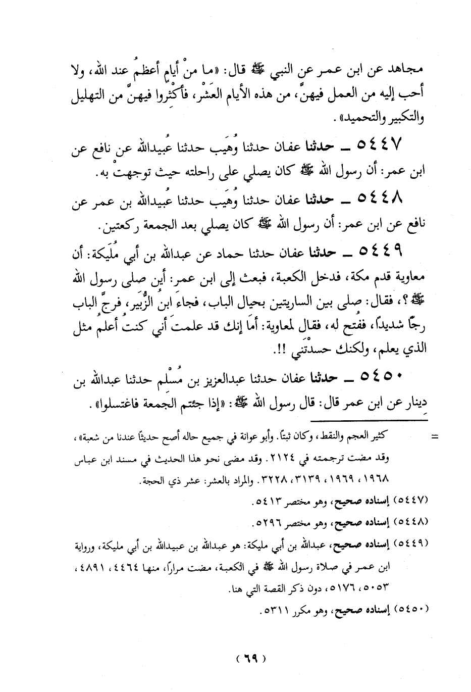 5450 - حدثنا عفان حدثنا عبد العزيز بن مُسْلم حدثنا عبد الله بن دِينار عن ابن عمر قال: قال رسول الله -صلي الله عليه وسلم -: "إذا جئتم الجَمعة فاغتسلوا".