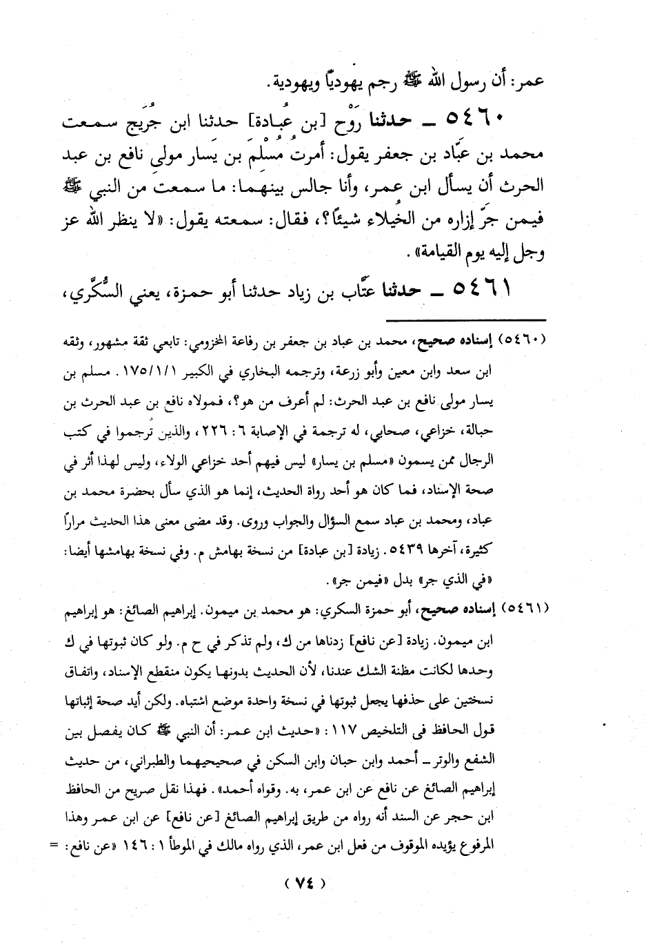 5460 - حدثنا رَوْح [بن عُبادة]، حدثنا ابن جُرَيج سمعت محمد بن عَبّاد بن جعفر يقول: أمرتُ مُسْلمَ بن يَسارمولىِ نافع بن عبد الحرث أن يسأل ابن عمر، وأنا جالس بينهَما: ما سمعت من النبي -صلي الله عليه وسلم - فيمن جَرّ إزاره من الخُيلاء شيئاً؟، فقال: سمعته يقول: "لا ينظر الله عز وجل إليه يوم القيامة".