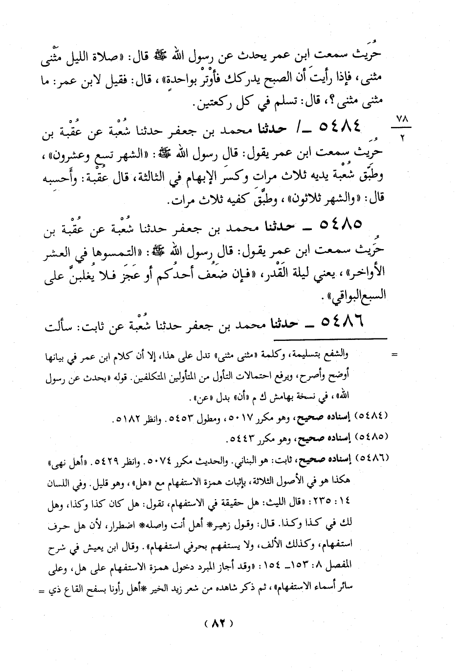 والشفع بتسليمة، وكلمة "مثنى مثني" تدل على هذا، إلا أن كلام ابن عمر في بيانها أوضح وأصرح، ويرفع احتمالات التأول من المتأولين المتكلفين. قوله "يحدث عن رسول الله"، في نسخة بهامش ك م "أن" بدل "عن".