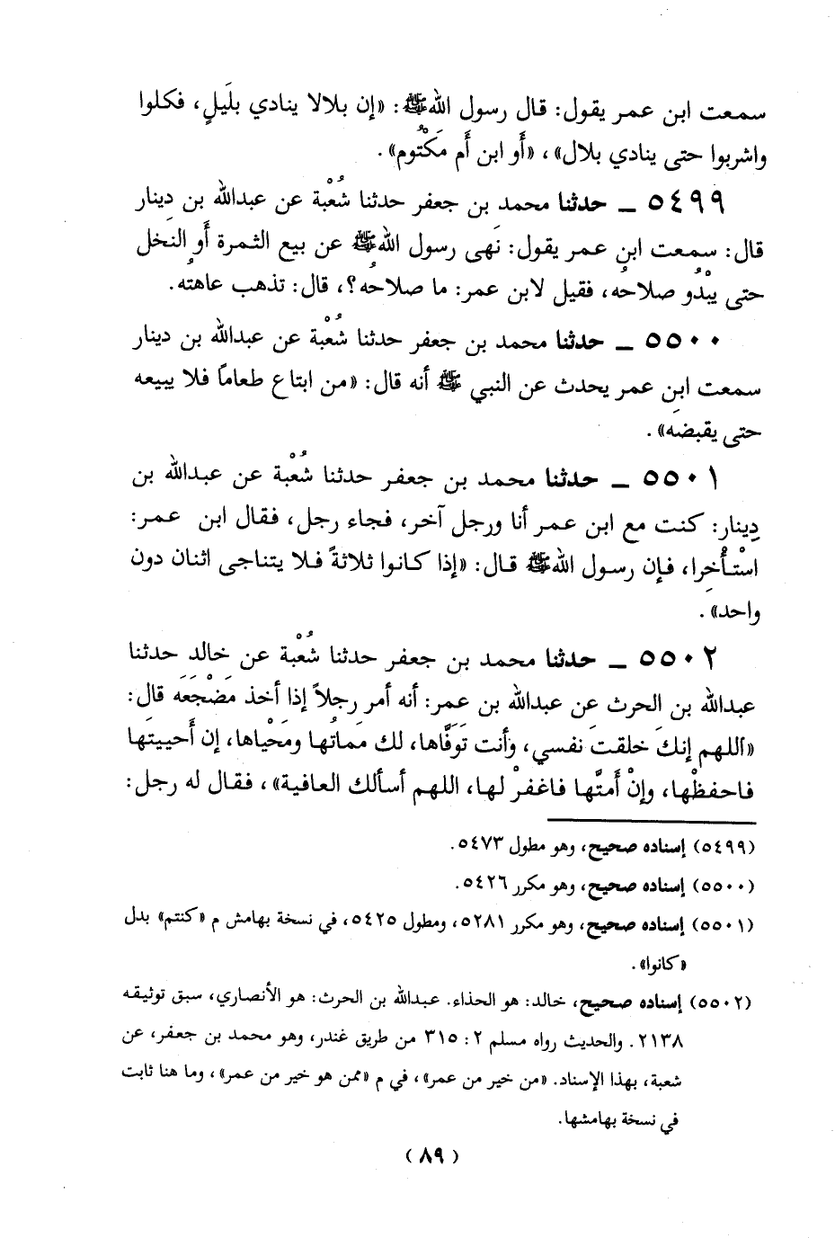 5500 - حدثنا محمد بن جعفر حدثنا شُعْبة عن عبد الله بن دينار سمعت ابِن عمر يحدث عن النبي -صلي الله عليه وسلم-أنه قال: "من ابتاع طعاماً فلا يبيعه حتى يقبضه".