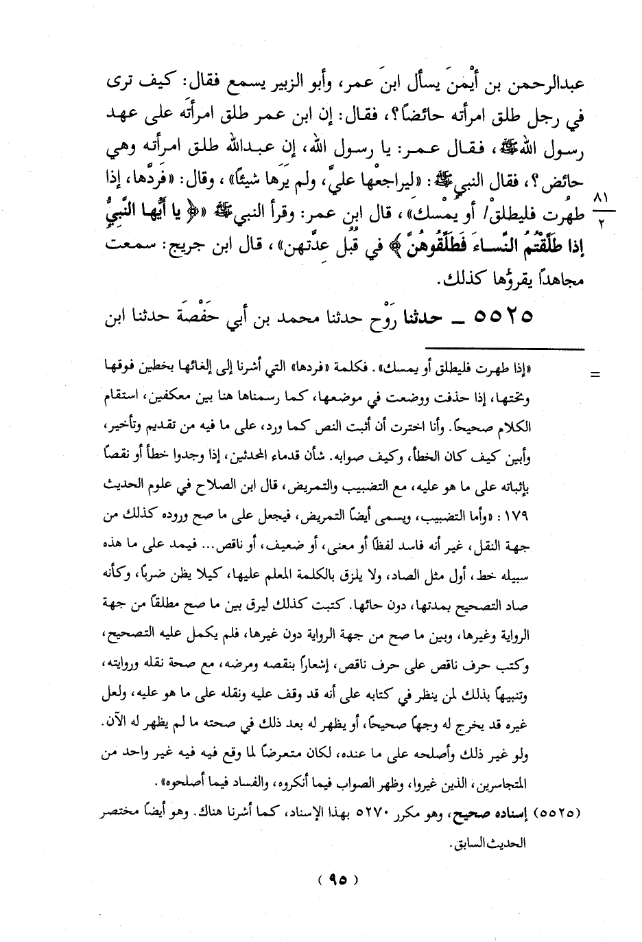 = "إذا طهرت فليطلق أو يمسك". فكلمة "فردها" التي أشرنا إلى إلغائها بخطين فوقها وتحتها، إذا حذفت ووضعت في موضعها، كما رسمناها هنا بين معكفين، استقام الكلام صحيحاً. وأنا اخترت أن أثبت النص كما ورد، على ما فيه من تقديم وتأخير، وأبين كيف كان الخطأ، وكيف صوابه. شأن قدماء المحدثين، إذا وجدوا خطأ أو نقصاً بإثباته على ما هو عليه، مع التضبيب والتمريض، قال ابن الصلاح في علوم الحديث 179:"وأما التضبيب، ويسمى أيضاً التمريض، فيجعل على ما صح وروده كذلك من جهة النقل، غير أنه فاسد لفظاً أو معنى، أو ضعيف، أو ناقص ... فيمد على ما هذه