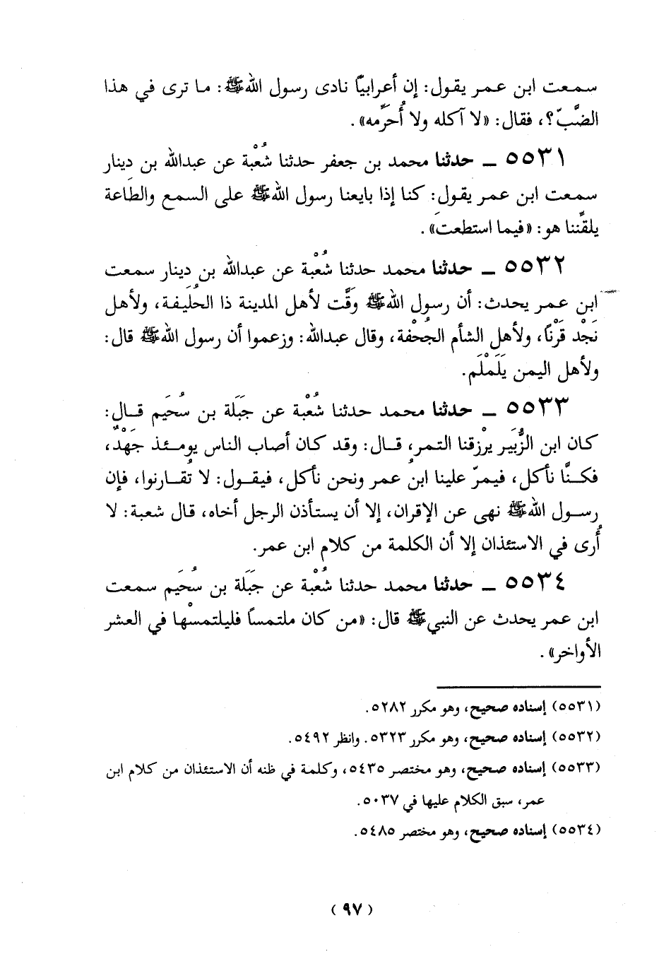 5534 - حدثنا محمد حدثنا شُعْبة عن جَبَلة بن سُحَيم سمعت ابن عمر يحدث عن النبي -صلي الله عليه وسلم- قال: "من كان ملتمساً فليلتمسْها في العشر الأواخر".