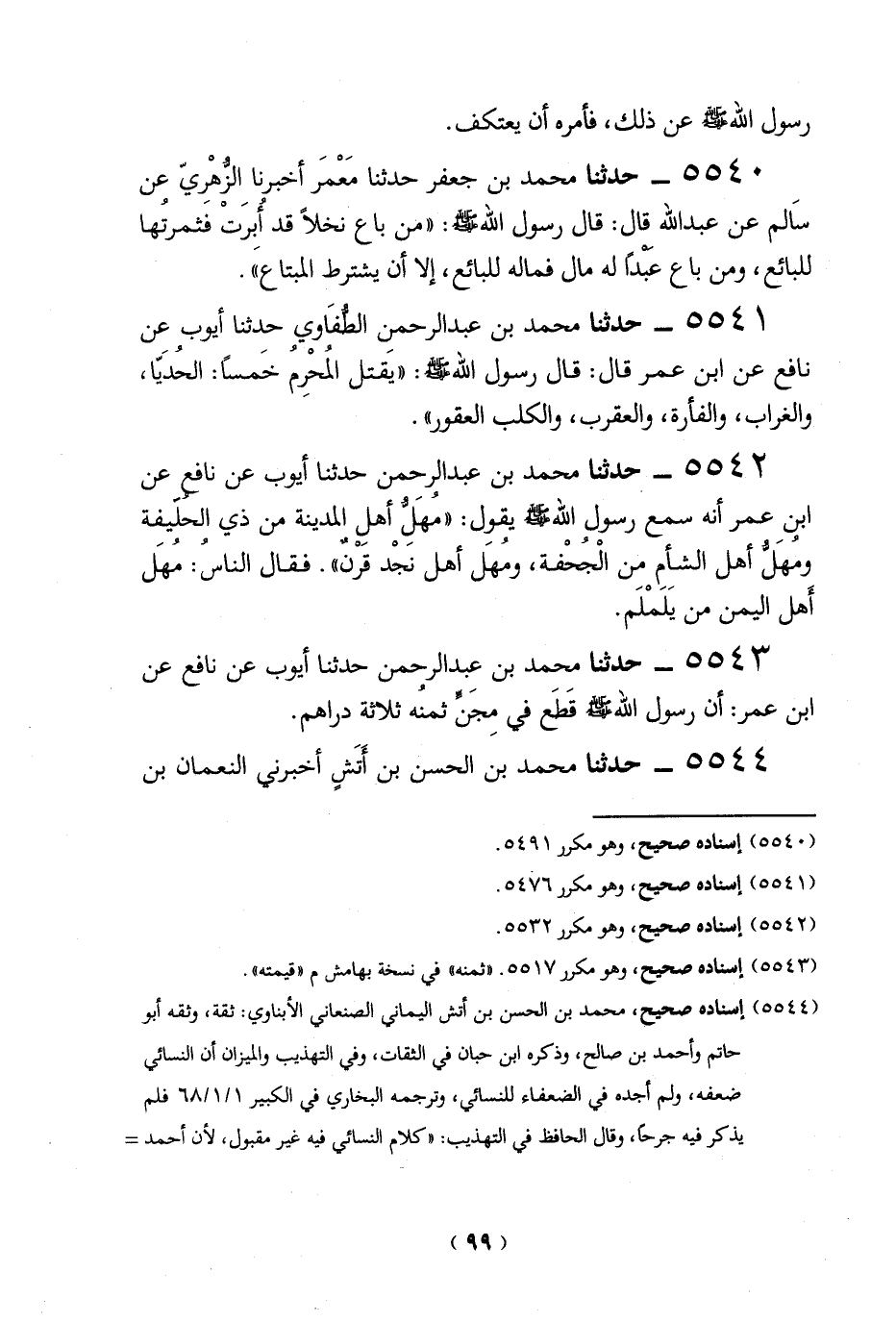 5542 - حدثنا محمد بن عبد الرحمن حدثنا أيوب عن نافعِ عن ابن عمر أنه سمع رسول الله -صلي الله عليه وسلم- يقول: "مُهَلُّ أهلِ المدينة من ذي الحليفة ومهَلُّ أهل الشأمِ من الْجُحْفة، ومُهَل أهل نجْد قرْنٌ". فقال الناسُ: مُهَل أَهل اليمن من يَلمْلَم.