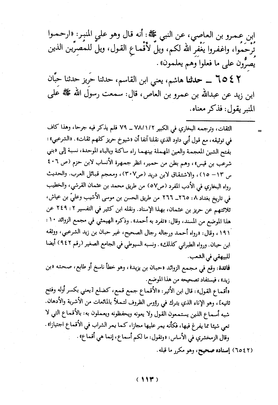 ابن عمرو بن العاصي، عن النبي -صلي الله عليه وسلم -: أنه قال وهو علي المنبر: "ارحموا تُرْحَموا، واغفروا يَغْفرِ الله لكم، ويلٌ لأقْماعِ القول، ويلٌ للمُصِرِّين الذين يُصِرُّون على ما فعلواَ وهم يعلمون".