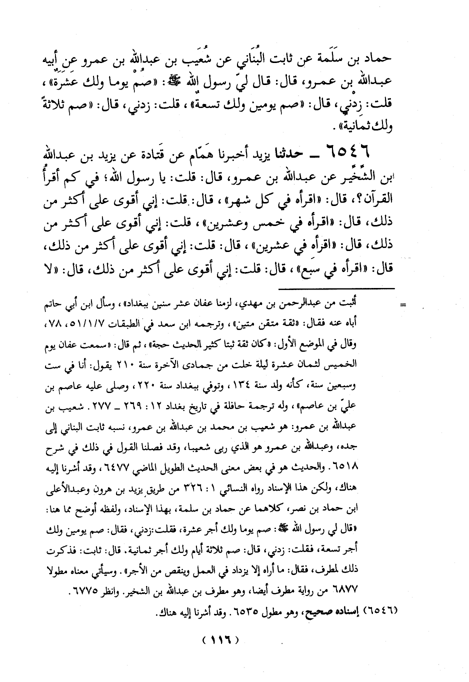 6546 - حدثنا يزيد أخبرنا هَمّام عن قَتادة عن يزيد بن عبد الله ابن الشِّخِّير عن عبد الله بن عمرو، قال: قلت: يا رسول الله؛ في كم أقرأ القرآن؟، قال: "اقرأه في كل شهر"، قال:. قلت: إني أقوى علي أكثر من ذلك، قال: "اقرأه في خمس وعشرين"، قلت: إني أقوى على أكثر من ذلك، قال: "اقرأهِ في عشرين"، قال: قلت: إني أقوى على أكثر من ذلك، قال: "اقرأه في سبع"، قال: قلت: إني أقوى على أكثر من ذلك، قال: "لا