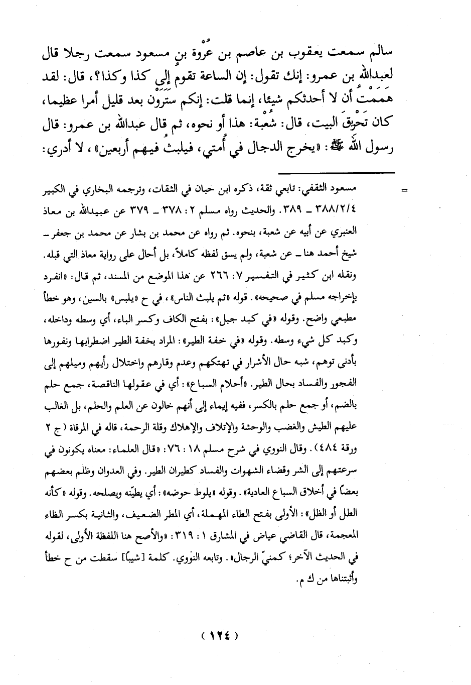 سالم سمعت يعقوب بن عاصم بن عرْوة بن مسعود سمعت رجلا قال لعبد الله بن عمرو: إنك تقول: إن الساعة تقوم إِلِىِ كذا وكذا؟، قال: لقد هَمَمْتُ أن لا أحدثكم شيئاً، إنما قلت: إنكم ستروْن بعد قليل أمرا عظيما، كان تَحْريقَ البيت، قال: شُعْبة: هذا أو نحوه، ثم قال عبد الله بن عمرو: قال رسول الله - صلى الله عليه وسلم -: "يخرج الدجال في أُمتي، فيلبثُ فيهم أربعين"، لا أدري: