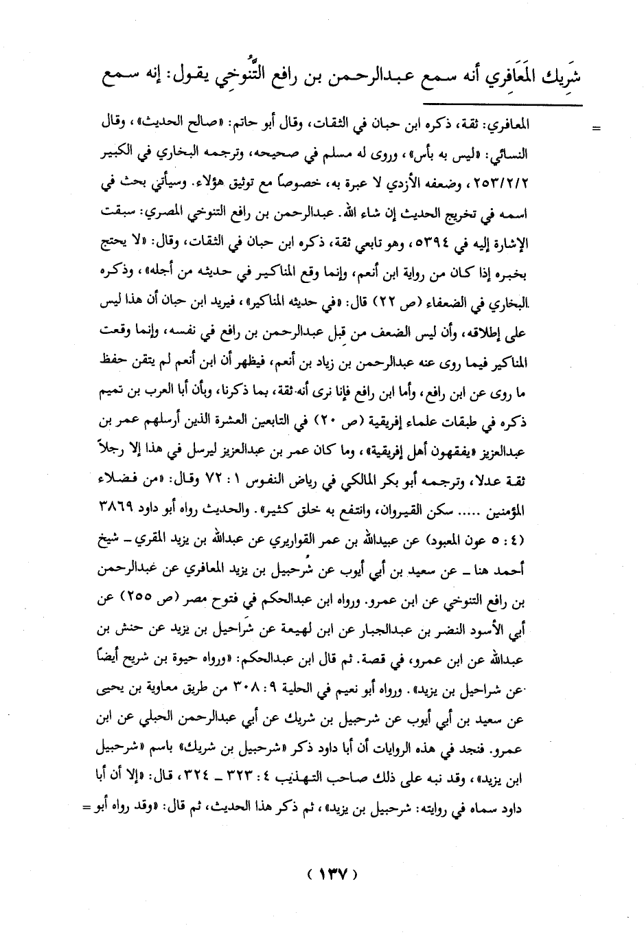 على إطلاقه، وأن ليس الضعف من قِبل عبد الرحمن بن رافع في نفسه، وإنما وقعت المناكير فيما روى عنه عبد الرحمن بن زياد بن أنعم، فيظهر أن ابن أنعم لم يتقن حفظ ما روى عن ابن رافع، وأما ابن رافع فإنا نرى أنه ثقة، بما ذكرنا "وبأن أبا العرب بن تميم ذكره في طبقات علماء إفريقية (ص 20) في التابعين العشرة الذين أرسلهم عمر بن عبد العزيز "يفقهون أهل إفريقية"، وما كان عمر بن عبد العزيز ليرسل في هذا إلا رجلاً ثقة عدلا، وترجمه أبو بكر المالكي في رياض النفوس 1: 72 وقال: "من فضلاء المؤمنين ..... سكن القيروان، وانتفع به خلق كثير". والحديث رواه أبو داود 3869 (4: 5 عون المعبود) عن عُبيد الله بن عمر القواريري عن عبد الله بن يزيد المقري- شيخ أحمد هنا- عن سعيد بن أبي أيوب عن شُرحبيل بن يزيد المعافري عن عبد الرحمن بن رافع التنوخي عن ابن عمرو. ورواه ابن عبد الحكم في فتوح مصر (ص 255) عن أبي الأسود النضر بن عبد الجبار عن ابن لهيعة عن شَراحيل بن يزيد عن حنش بن عبد الله عن ابن عمرو، في قصة. ثم قال ابن عبد الحكم: "ورواه حيوة بن شريح أيضاً ْعن شراحيل بن يزيد". ورواه أبو نعيم في الحلية 9: 308 من طريق معاوية بن يحيى