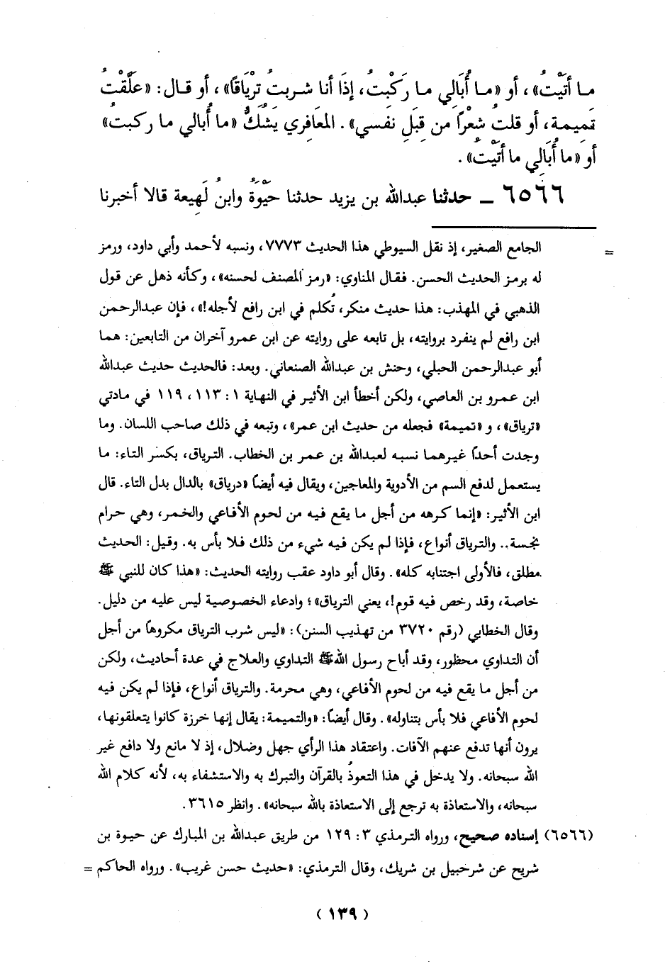 = الجامع الصغير، إذ نقل السيوطي هذا الحديث 7773، ونسبه لأحمد وأبي داود، ورمز له برمز الحديث الحسن. فقال المناوي: "رمز المصنف لحسنه"، وكأنه ذهل عن قول الذهبي في المهذب: هذا حديث منكر، تُكلم في ابن رافع لأجله! "، فإن عبد الرحمن ابن رافع لم ينفرد بروايته، بل تابعه على روايته عن ابن عمرو آخران من التابعين: هما أبو عبد الرحمن الحبلي، وحنش بن عبد الله الصنعاني. وبعد: فالحديث حديث عبد الله ابن عمرو بن العاصي، ولكن أخطأ ابن الأثير في النهاية 1: 113، 119 في مادتي "ترياق"، و"تميمة" فجعله من حديث ابن عمر"، وتبعه في ذلك صاحب اللسان. وما