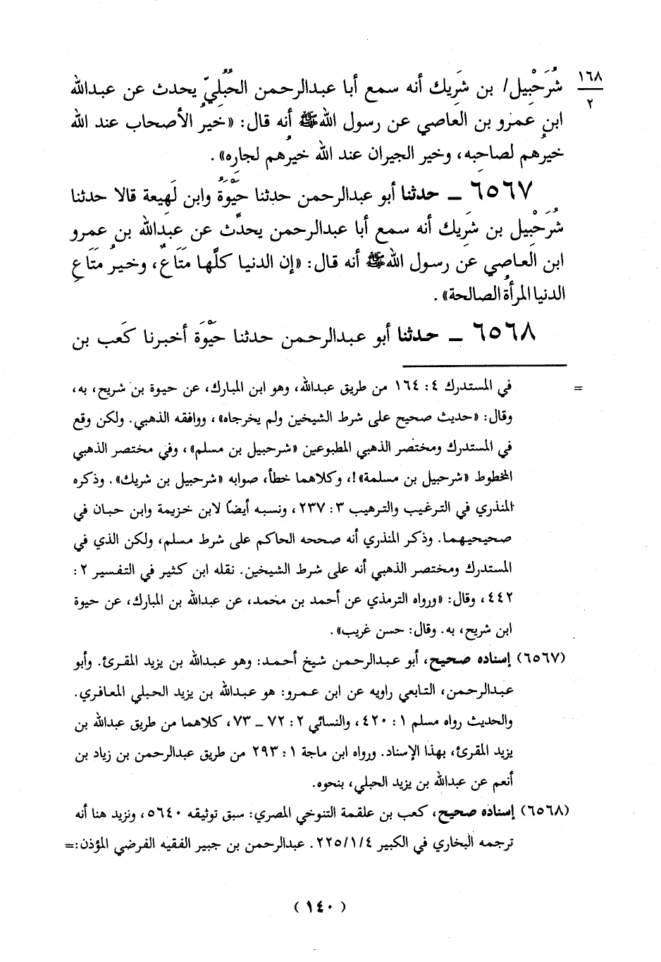 ِ6567 - حدثنا أبو عبد الرحمن حدثنا حَيوُة وابن لَهِيعة قالا حدثنا شُرَحْبيل بن شرِيك أنه سمع أبا عبد الرحمن يحدِّث عن عبد الله بن عمرو ابن الَعاصي عن رسول الله -صلي الله عليه وسلم - أنه قال:"إن الدنيا كلَّها مَتَاعٌ، وخير مَتَاعِ الدنيا المرأة الصالحة".