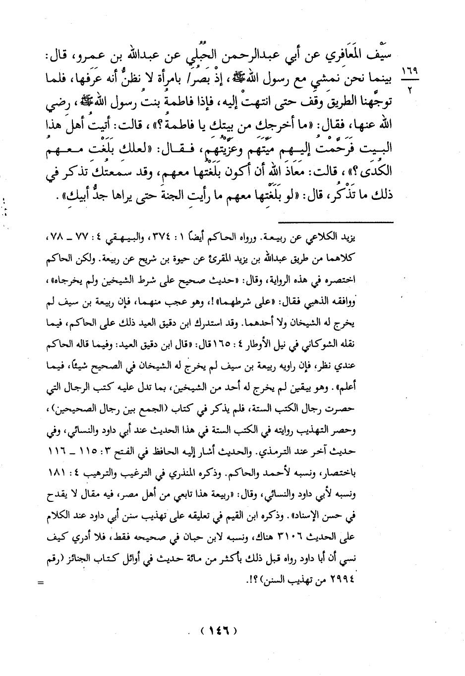 سيف المَعَافِري عن أبي عبد الرحمن الحُبُليِ عن عبد الله بن عمرو، قال: بينما نحن نمشِيِ مع رسول الله -صلي الله عليه وسلم -، إذْ بَصُر بامرأة لا نظنُّ أنه عَرَفها، فلما توجَّهنا الطريق وقف حتى انتهتْ إليه، فإذا فاطمةُ بنتُ رسول الله-صلي الله عليه وسلم-، رضي الله عنها، فقال: "ما أخرجكِ من بيتك يا فاطمةُ؟ "، قالت: أتيتُ أهلَ هذا البيت فَرَحَّمْتُ إليهم ميتَهم وعزيتهم، فقال: "لعلك بَلَغْت معهمُ الكُدَى؟ "، قالت: مَعَاذَ الله أن أكون بَلَغْتها معهمِ، وقد سَمعتُكَ تذكر في ذلك ما تَذْكُر، قال: "لو بَلَغتِها معهم ما رأيتِ الجنة حتى يراها جدُّ أبيكِ".