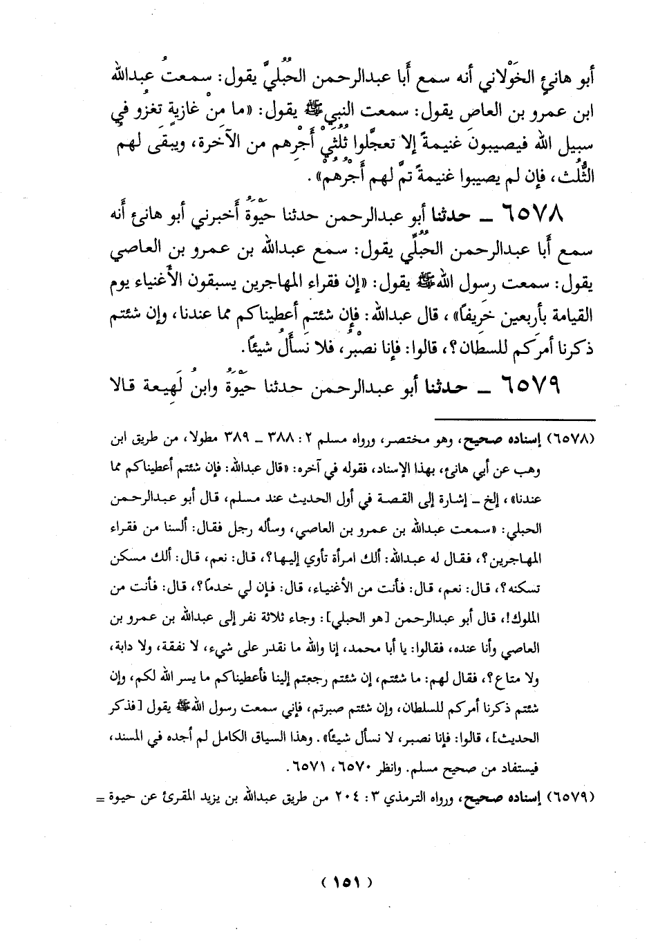 أبو هانئ الخَوْلاني أنه سمع ابا عبد الرحمن الحُبُليَّ يقول: سمعت عبد الله ابن عمرو بن العاصِ يقول: سمعت النبي -صلي الله عليه وسلم - يقول: "ما مِنْ غازيةٍ تغزو في سبيل الله فيصيبون غنيمةً إلا تعجَّلوا ثلثي أجرهم من الآخرة، ويبقَى لهم الثُّلُث، فإن لم يصيبوا غنيمةً تم لهم أَجْرُهُم".