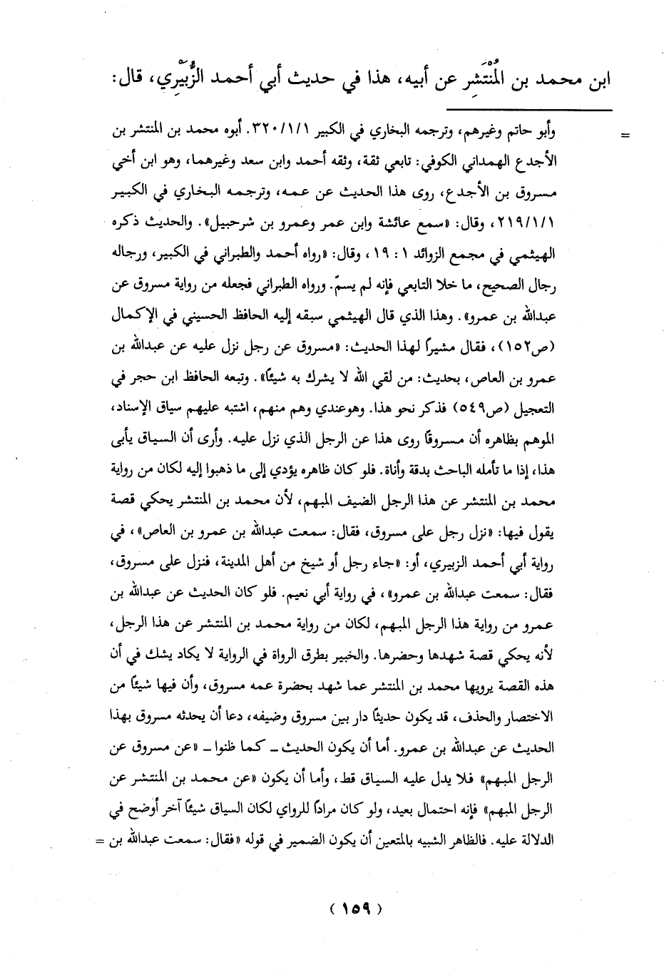 يقول فيها: "نزل رجل على مسروق، فقال: سمعت عبد الله بن عمرو بن العاص"، في رواية أبي أحمد الزبيري، أو:"جاء رجل أو شيخ من أهل المدينة، فنزل على مسروق، فقال: سمعت عبد الله بن عمرو"، في رواية أبي نعيم. فلو كان الحديث عن عبد الله بن عمرو من رواية هذا الرجل المبهم، لكان من رواية محمد بن المنتشر عن هذا الرجل، لأنه يحكي قصة شهدها وحضرها. والخبير بطرق الرواة في الرواية لا يكاد يشك في أن هذه القصة يرويها محمد بن المنتشر عما شهد بحضرة عمه مسروق، وأن فيها شيئاً من الاختصار والحذف، قد يكون حديثاً دار بين مسروق وضيفه، دعا أن يحدثه مسروق بهذا الحديث عن عبد الله بن عمرو. أما أن يكون الحديث- كما ظنوا- "عن مسروق عن الرجل المبهم" فلا يدل عليه السياق قط، وأما أن يكون "عن محمد بن المنتشر عن الرجل المبهم" فإنه احتمال بعيد، ولو كان مراداً، للرواي لكان السياق شيئاً آخر أوضح في الدلالة عليه. فالظاهر الشبيه بالمتعين أن يكون الضمير في قوله "فقال: سمعت عبد الله بن =