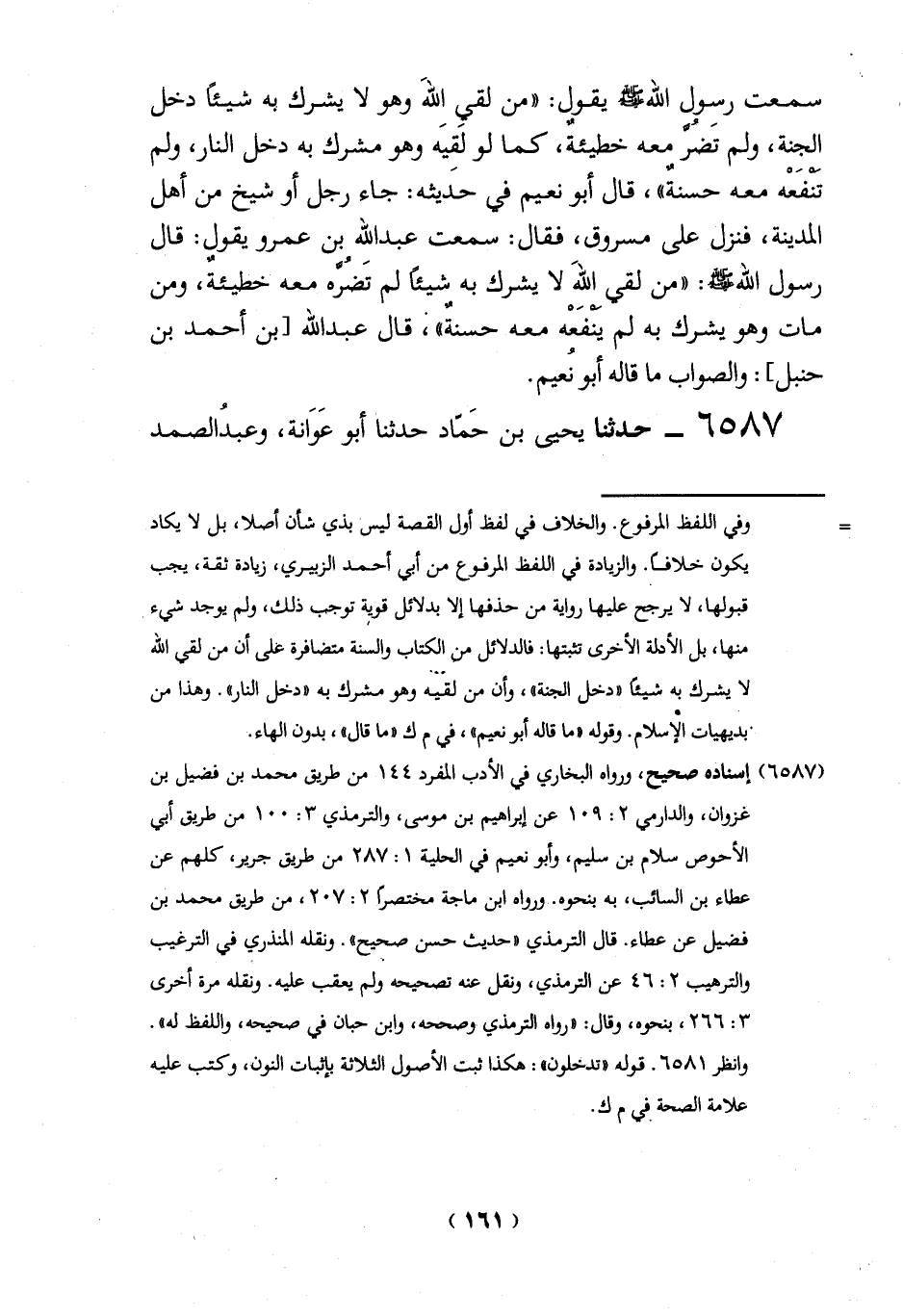 سمعت رسول الله -صلي الله عليه وسلم - يقول: "من لقيِ اللهَ وهو لا يشرك به شيئاً دخل الجنة، ولم تَضُرَّ معه خطيئةٌ، كما لو لقيَه وهو مشرك به دخل النار، ولم تنفَعْه معه حسنةٌ"، قال أبو نعيم في حَديثه: جاء رجل أو شيخ من أهل المدينة، فنزل على مسروق، فقال: سمعت عبد الله بن عمرو يقول: قال رسول الله -صلي الله عليه وسلم -: "من لقي اللهَ لا يشرك به شيئاً لم تَضُرَّه معه خطيئة، ومن