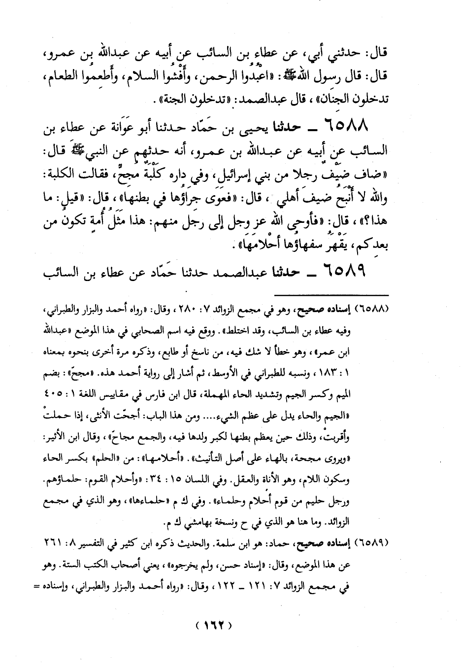 قال: حدثني أبي، عن عطاء بن السائب عن أبيه عن عبد الله بن عمرو، قال: قال رسول الله -صلي الله عليه وسلم -: "اعبدوا الرحمن، وأفْشُوا السلام، وأطعموا الطعام، تدخلون الجِنَان"، قال عبد الصمد: "تدخلون الجنة".