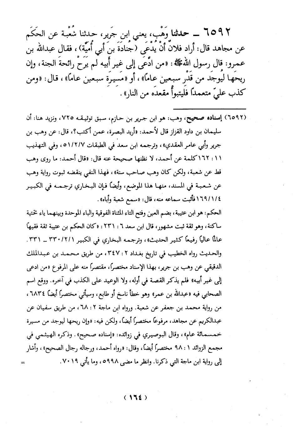 6592 - حدثنا وَهْب، يعني ابن جَرير، حدثنا شُعْبة عن الحَكَم عن مجاهد قال: أراد فلانٌ أنْ يدْعَىِ (جنادَةَ بنَ أبي أميِة)، فقال عبد الله بن عمرو: قال رسول الله -صلي الله عليه وسلم -: "من إدَّعى إلى غير أَبيه لم يرَحْ رائحةَ الجنة، وإن ريحَها ليُوجَد من قَدْرِ سبعين عاماً"، أو "مَسِيرِة سبعين عاماً"، قال: "ومن كذب على متعمداً فليتبوأ مقعدَه من النار".