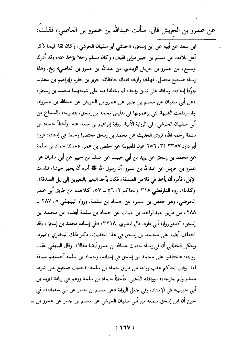وقد ارتفعت الشبهة التي يزعمونها في تدليس محمد بن إسحق، بتصريحه بالسماع من أبي سفيان الحرشي، في الرواية الآتية: رواية إبراهيم بن سعد عنه. وأخطأ حماد بن سلمة رحمه الله، فروى الحديث عن محمد بن إسحق مختصرا وخلط في إسناده: فرواه أبو داود 3357 (3: 256 عون المعبود) عن حفص بن عمر: "حدثنا حماد بن سلمة عن محمد بن إسحق عن يزيد بن أبي حبيب عن مسلم بن جُبير عن أبي سفيان عن عمرو بن حريش عن عبد الله بن عمرو: أن رسول الله -صلي الله عليه وسلم - أمره أن يجهز جيشا، فنفدت الإبل، فأمره أن يأخذ في قلاص الصدقة، فكان يأخذ البعير بالبعيرين إلى إبل الصدقة".