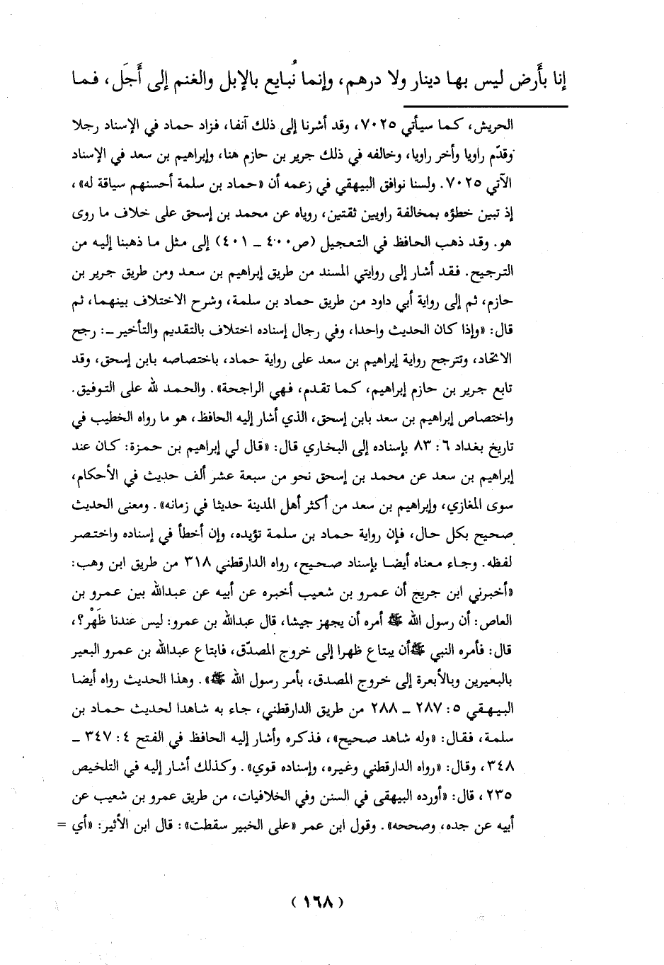 واختصاص إبراهيم بن سعد بابن إسحق، الذي أشار إليه الحافظ، هو ما رواه الخطيب في تاريخ بغداد 6: 83 بإسناده إلى البخاري قال: "قال لي إبراهيم بن حمزة: كان عند إبراهيم بن سعد عن محمد بن إسحق نحو من سبعة عشر ألف حديث في الأحكام، سوى المغازي، وإبراهيم بن سعد من أكثر أهل المدينة حديثا في زمانه". ومعنى الحديث صحيح بكل حال، فإن رواية حماد بن سلمة تؤيده، وإن أخطأ في إسناده واختصر لفظه. وجاء معناه أيضاً بإسناد صحيح، رواه الدارقطني 318 من طريق ابن وهب: "أخبرني ابن جُريج أن عمرو بن شعيب أخبره عن أبيه عن عبد الله بين عمرو بن العاص: أن رسول الله -صلي الله عليه وسلم - أمره أن يجهز جيشا، قال عبد الله بن عمرو: ليس عندنا ظَهْر؟،