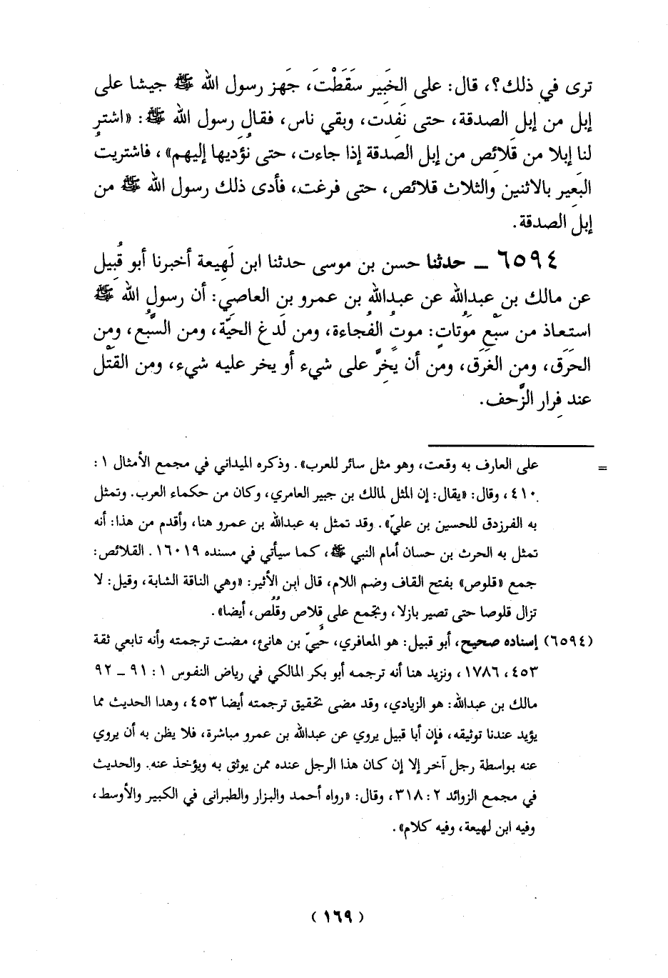 6594 - حدثنا حسن بن موسى حدثنا ابن لَهِيعة أخبرنا أبو قبيل عن مالك بن عبدِ الله عن عبد الله بن عمرو بن العاصي: أن رسول اللهَ - صلى الله عليه وسلم - استعاذ من سبعٍ موُتاتٍ: موتٍ الفُجاءة، ومن لَدغ الحَيّة، ومن السَّبع، ومن الحَرَق، ومن الغرق، ومن أن يخِر على شيء أو يخر عليه شيء، ومن القتل عند فِرار الزحف.