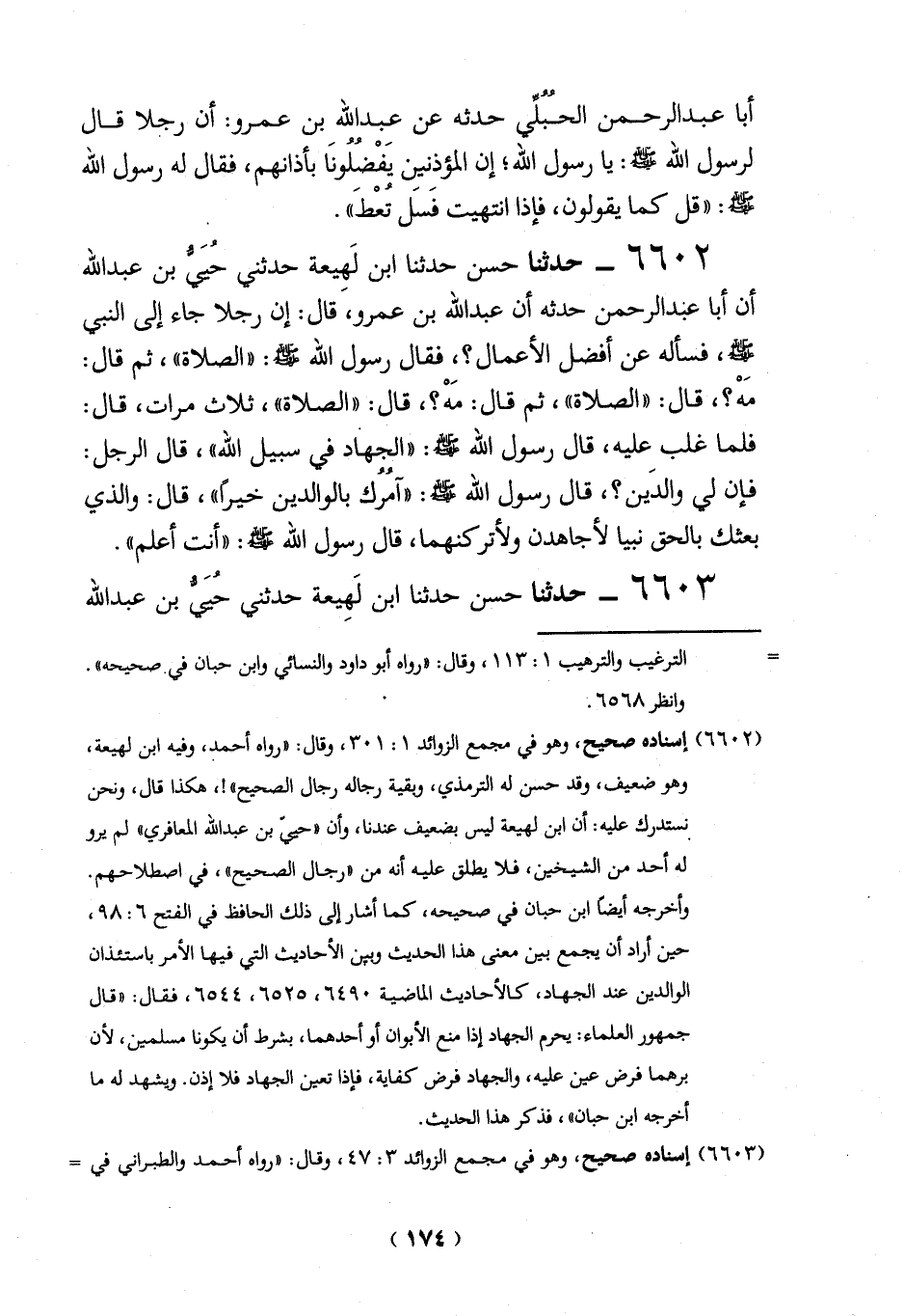 6602 - حدثنا حسن حدثنا ابن لَهِيعة حدثني حُيَيُّ بن عبد الله أن أبا عبد الرحمن حدثه أن عبد الله بن عمرو، قال: إن رجلاً جاء إلى النبي -صلي الله عليه وسلم - فسأله عن أفضل الأعمال؟، قال رسول الله -صلي الله عليه وسلم -: "الصلاة"، ثم قال: مَهْ؟، قال: "الصلاة"، ثم قال: مَهْ؟، قال: "الصلاة"، ثلاث مرات، قال: فلما غلب عليه، قال رسول الله -صلي الله عليه وسلم -: "الجهاد في سبيل الله"، قال الرجل: فإن لي والدَين؟، قال رسول الله -صلي الله عليه وسلم -: "آمُرُك بالوالدين خيراً"، قال: والذي بعثك بالحق نبيا لأجاهدن ولأتركنهما، قال رسول الله -صلي الله عليه وسلم -: "أنت أعلم".