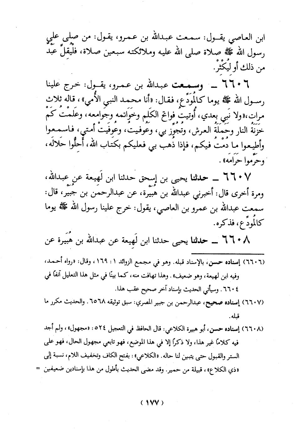 6607 - حدثنا يحيى بن إسحق حدثنا ابن لَهِيعة عن عبد الله، ومرة أخرى قال: أخبرني عبد الله بن هُبيرة، عن عبد الرحمن بن جُبير، قال: سمعت عبد الله بن عمرو بن العاصي، يقول: خرج علينا رسول الله -صلي الله عليه وسلم - يوما كالمُودِّع، فذكره.