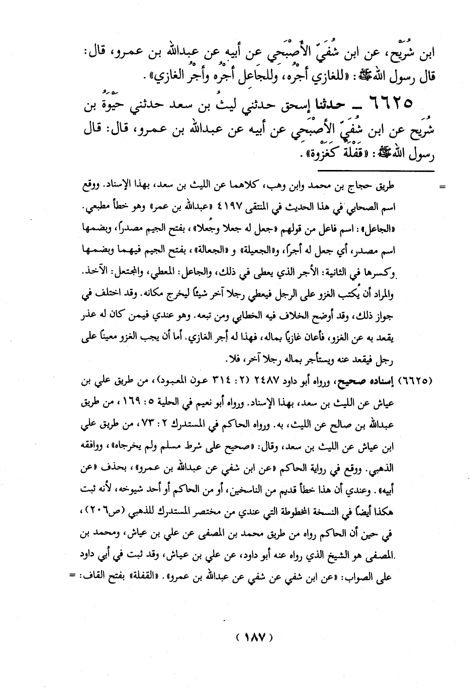 6625 - حدثنا إِسحق حدثني ليث بن سعد حدثني حيوُة بن شرَيح عن ابن شفيَ الأصْبحي عن أبيه عن عبد الله بن عمرو، قال: قال رسول الله: "قَفْلة كَغَزْوة".