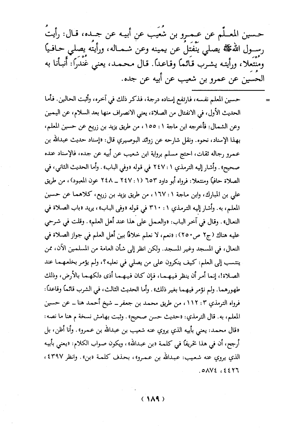 حسين المعلِّم عن عمرو بن شعَيب عن أبيه عن جده، قال: رأيتُ رسول الله -صلي الله عليه وسلم - يصلي ينفَتلُ عن يمينه وعن شماله، ورأيته يصلي حافياً ومُنْتَعلا، ورأيته يشرب قَائماً وقاعداً. قال محمد، يعني غُنْدَراً: أنبأنا به الحُسَين عن عمرو بن شعيب عن أبيه عن جده.