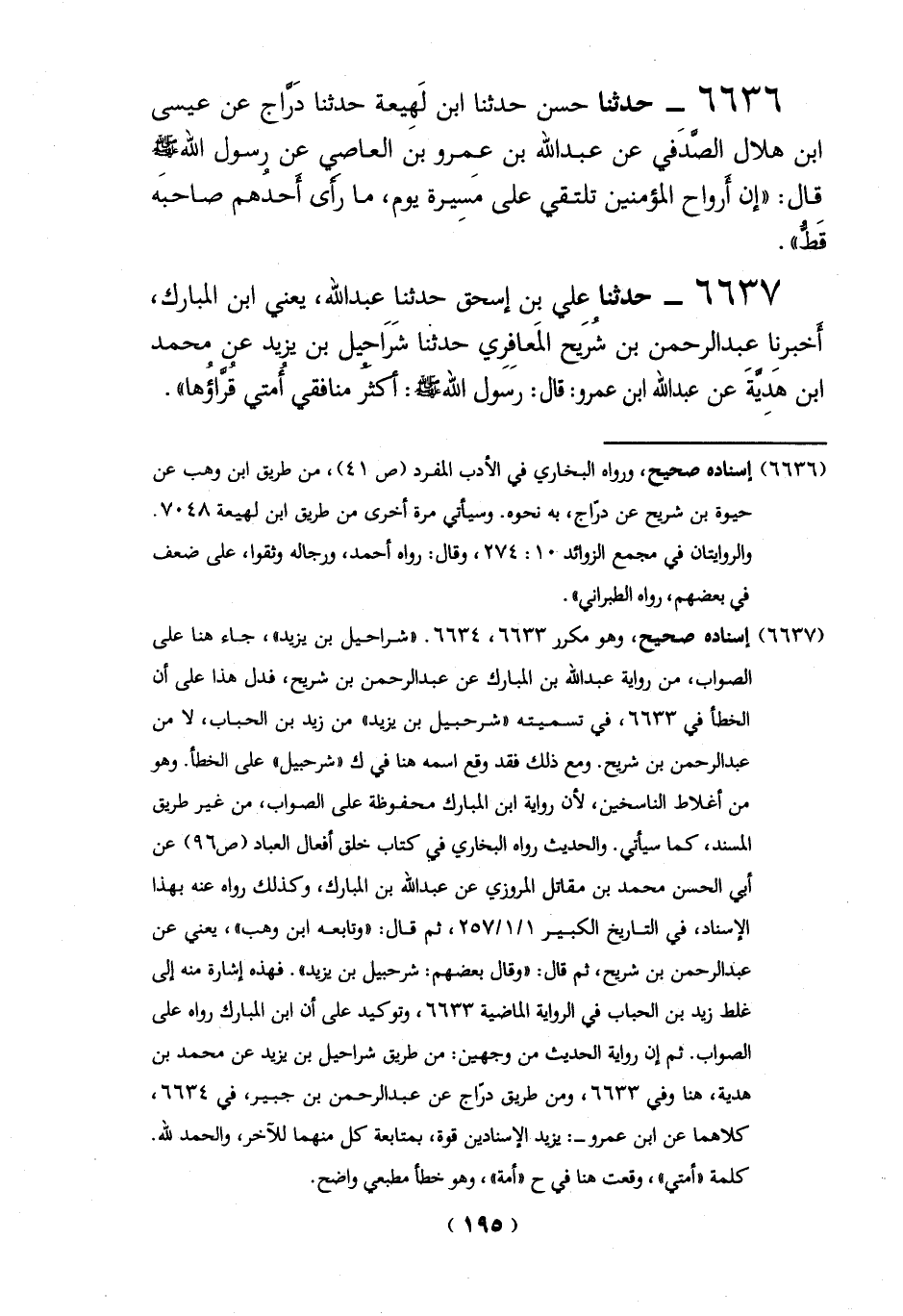 6636 - حدثنا حسن حدثنا ابن لَهِيعة حدثنا دَرَّاج عن عيسى ابن هلال الصَّدَفي عن عبد الله بن عِمرو بن العاصي عن رسول الله -صلي الله عليه وسلم - قال: "إن أرواح المؤمنين تلتقي على مسيرة يوم، ما رأى أحدُهم صاحبَه قَطُّ".
