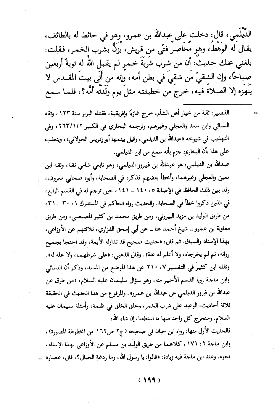 الدَّيْلَمي، قال: دخلت على عبد الله بن عمرو، وهو في حائط له بالطائف، يقالَ له الوَهْطُ، وهو مُخَاصر فتًى منِ قريش، يُزَنُّ بشرب الخمر، فقلت: بلغني عنك حديث: أِن من شرب شربَةَ خمرٍ لم يقبل الله له توبةً أربعين صباحاً، وإن الشقي من شقِيَ في بطن أمه، وإنه من أتَى بيتَ المقدس لا