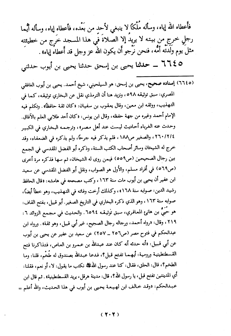 (6645) إسناده صحيح، يحيى بن إسحق: هو السيلحيني، شيخ أحمد. يحيى بن أيوب الغافقي المصري: سبق توثيقه 598، ونزيد هنا أن الترمذي نقل عن البخاري توثيقه، كما في التهذيب، ووثقه ابن معين، وقال يعقوب بن سفيان: "كان ثقة حافظاً". وتكلم فيه الإِمام أحمد وغيره من جهة حفظه، وقال ابن يونس: "كان أحد طلابي العلم بالآفاق.