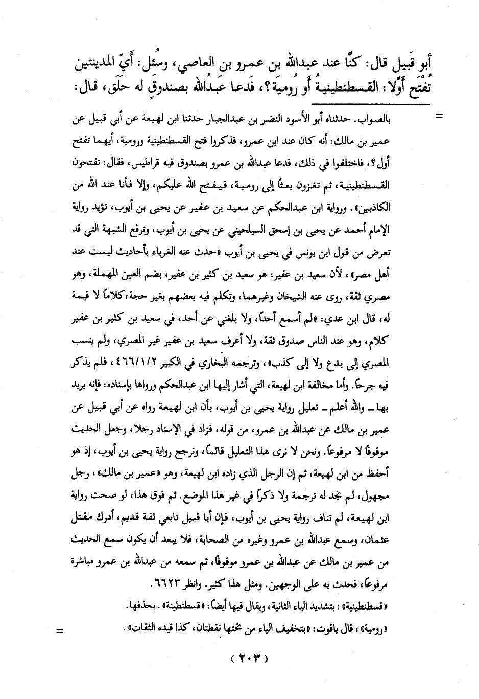 = بالصواب. حدثناه أبو الأسود النضر بن عبد الجبار حدثنا ابن لهيعة عن أبي قبيل عن عمير بن مالك: أنه كان عند ابن عمرو، فذكروا فتح القسطنطنية ورومية، أيهما تفتح أول؟، فاختلفوا في ذلك، فدعا عبد الله بن عمرو بصندوق فيه قراطيس، فقال: تفتحون القسطنطينية، ثم تغزون بعثاً إلى رومية، فيفتح الله عليكم، وإلا فأنا عند الله من الكاذبين". ورواية ابن عبد الحكم عن سعيد بن عفير عن يحيى بن أيوب، تؤيد رواية الإِمام أحمد عن يحيى بن إسحق السيلحيني عن يحيى بن أيوب، وترفع الشبهة التي قد تعرض من قول ابن يونس في يحيى بن أيوب "حدث عنه الغرباء بأحاديث ليست عند أهل مصر" لأن سعيد بن عفير: هو سعيد بن كثير بن عفير، بضم العين المهملة، وهو مصري ثقة، روى عنه الشيخان وغيرهما، وتكلم فيه بعضهم بغير حجة، كلاماً لا قيمة له، قال ابن عدي: "لم أسمع أحداً، ولا بلغني عن أحد، في سعيد بن كثير بن عفير كلام، وهو عند الناس صدوق ثقة، ولا أعرف سعيد بن عفير غير المصري، ولم ينسب المصري إلى بدع ولا إلى كذب"، وترجمه البخاري في الكبير 2/ 1/466، فلم يذكر فيه جرحاً. وأما مخالفة ابن لهيعة، التي أشار إليها ابن عبد الحكم ورواها بإسناده: فإنه يريد بها- والله أعلم- تعليل رواية يحيى بن أيوب، بأن ابن لهيمة رواه عن أبي قبيل عن عمير بن مالك عن عبد الله بن عمرو، من قوله، فزاد في الإسناد رجلاً، وجعل الحديث موقوفاً لا مرفوعاً. ونحن لا نرى هذا التعليل قائماً، ونرجح رواية يحيى بن أيوب، إذ هو أحفظ من ابن لهيعة، ثم إن الرجل الذي زاده ابن لهيعة، وهو"عمير بن مالك"، رجل مجهول، لم نجد له ترجمة ولا ذكراً في غير هذا الموضع. ثم فوق هذا، لو صحت رواية ابن لهيعة، لم تناف رواية يحيى بن أيوب، فإن أبا قبيل تابعي ثقة قديم، أدرك مقتل عثمان، وسمع عبد الله بن عمرو وغيره من الصحابة، فلا يبعد أن يكون سمع الحديث