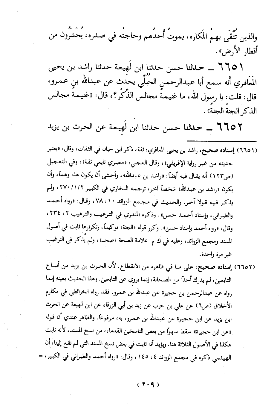 6651 - حدثنا حسن حدثنا ابن لَهِيعة حدثنا راشد بن يحيى المَعَافري أَنه سمع أبا عبد الرحمن الحُبُلِّي يحدث عن عبد الله بن عمرو، قال: قلت: يا رسول الله، ما غنيمة مجالس الذِّكْر؟، قال: "غنيمة مجالس