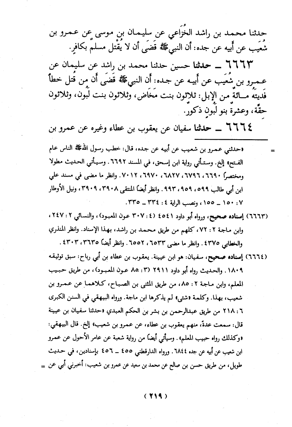 = "حدثني عمرو بن شعيب عن أبيه عن جده، قال: خطب رسول الله -صلي الله عليه وسلم - الناس عام الفتح"، إلخ. وستأتي رواية ابن إسحق، في المسند 6692. وسيأتي الحديث مطولاً ومختصراً 6690، 6796،6827 , 6970، 7012. وانظرما مضى في مسند علي ابن أبي طالب 559، 959، 993. وانظر أيضاً المنتقى 3908، 3909، وقيل الأوطار 7: 150 - 155، ونصب الراية 4: 334 - 335.
