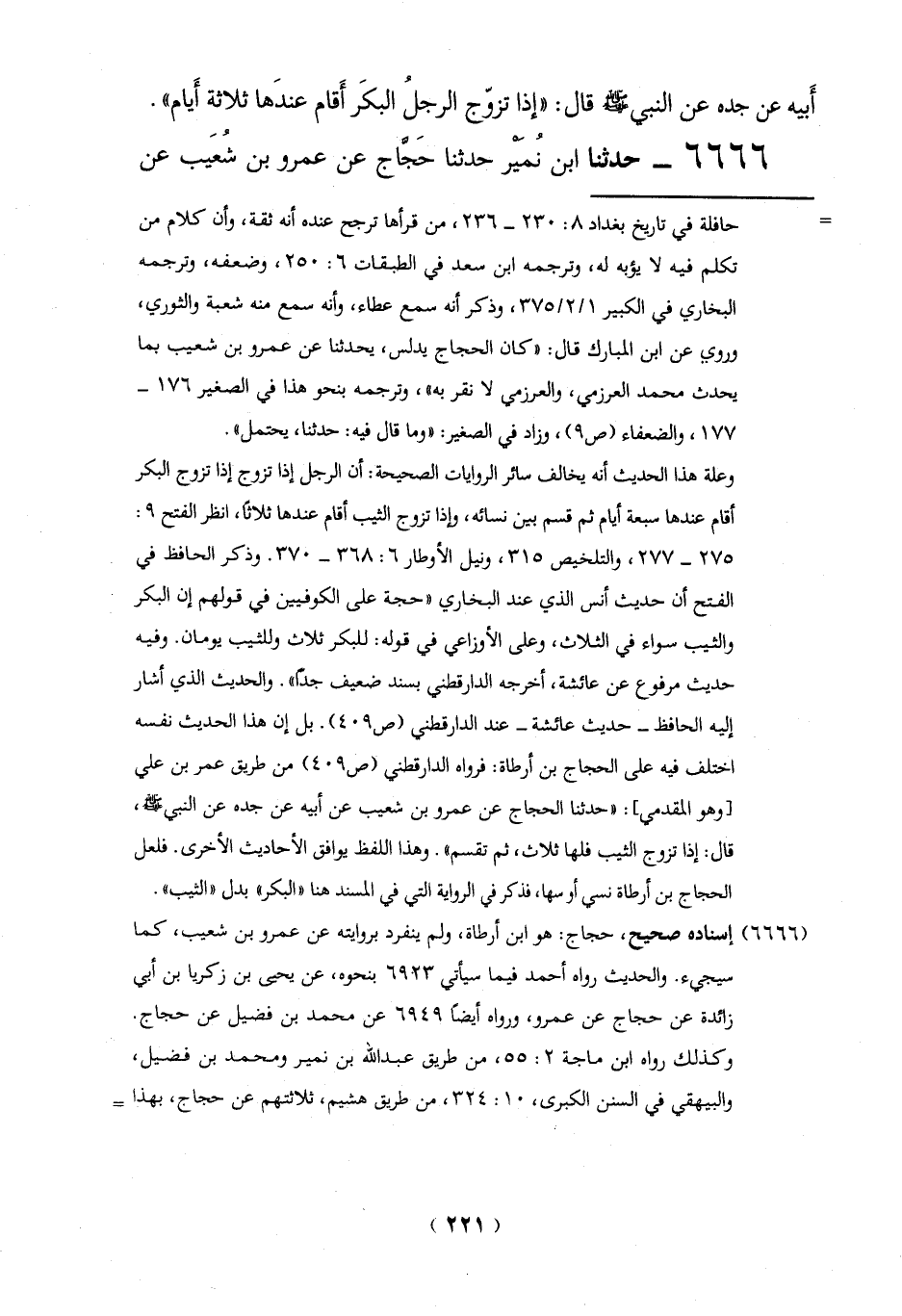 وعلة هذا الحديث أنه يخالف سائر الروايات الصحيحة: أن الرجل إذا تزوج إذا تزوج البكر أقام عندها سبعة أيام ثم قسم بين نسائه، وإذا تزوج الثيب أقام عندها ثلاثاً، انظر الفتح 9: 275 - 277، والتلخيص 315، ونيل الأوطار 6: 368 - 370. وذكر الحافظ في الفتح أن حديث أنس الذي عند البخاري "حجة على الكوفيين في قولهم إن البكر والثيب سواء في الثلاث، وعلى الأوزاعي في قوله: للبكر ثلاث وللثيب يومان. وفيه حديث مرفوع عن عائشة، أخرجه الدارقطني بسند ضعيف جداً". والحديث الذي أشار إليه الحافظ- حديث عائشة- عند الدارقطني (ص 409). بل إن هذا الحديث نفسه اختلف فيه على الحجاج بن أرطأة: فرواه الدارقطني (ص 409) من طريق عمر بن علي [وهو المقدمي]: "حدثنا الحجاج عن عمرو بن شعيب عن أبيه عن جده عن النبي - صلى الله عليه وسلم -، قال: إذا تزوج الثيب فلها ثلاث، ثم تقسم". وهذا اللفظ يوافق الأحاديث الأخرى. فلعل الحجاج بن أرطأة نسي أوسها، فذكر في الرواية التي في المسند هنا " البكر" بدل "الثيب".
