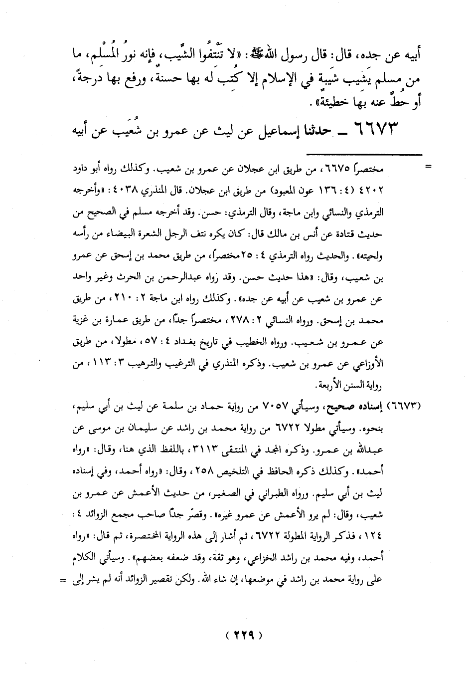 = مختصراً 6675، من طريق ابن عجلان عن عمرو بن شعيب. وكذلك رواه أبو داود 4202 (4: 136 عون المعبود) من طريق ابن عجلان. قال المنذري 4038: "وأخرجه الترمذي والنسائي وابن ماجة، وقال الترمذي: حسن. وقد أخرجه مسلم في الصحيح من حديث قتادة عن أنس بن مالك قال: كان يكره نتف الرجل الشعرة البيضاء من رأسه ولحيته". والحديث رواه الترمذي 4: 25 مختصراً , من طريق محمد بن إسحق عن عمرو بن شعيب، وقال: "هذا حديث حسن. وقد رواه عبد الرحمن بن الحرث وغير واحد عن عمرو بن شعيب عن أبيه عن جده". وكذلك رواه ابن ماجة 2: 210، من طريق محمد بن إسحق. ورواه النسائي 2: 278، مختصراً جداً، من طريق عمارة بن غزية