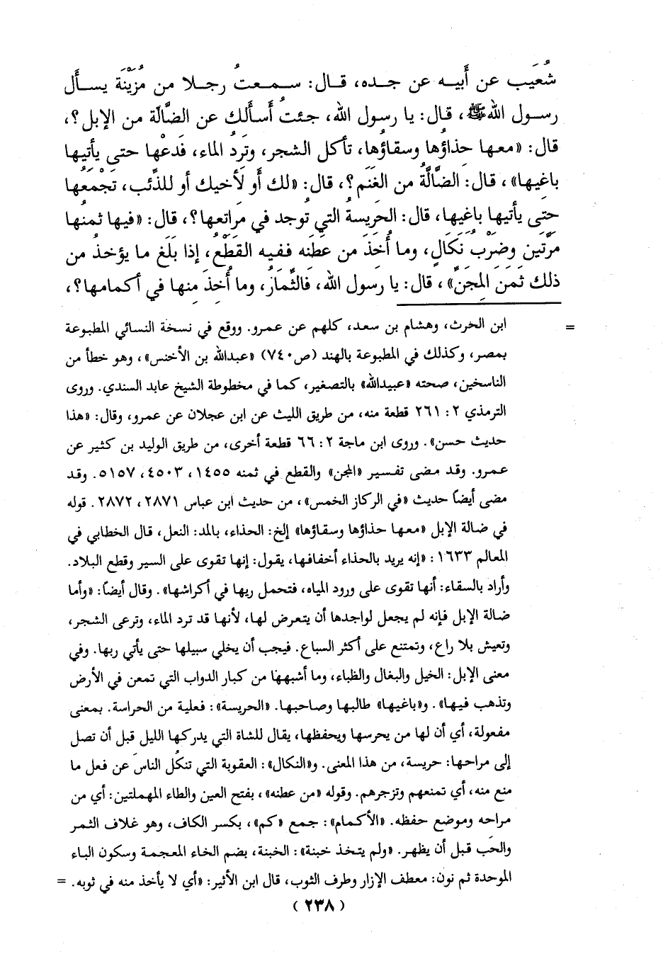 وأراد بالسقاء: أنها تقوى على ورود المياه، فتحمل ريها في أكراشها". وقال أيضاً: "وأما ضالة الإبل فإنه لم يجعل لواجدها أن يتعرض لها, لأنها قد ترد الماء، وترعى الشجر، وتعيش بلا راع، وتمتنع على أكثر السباع. فيجب أن يخلي سبيلها حتى يأتي ربها. وفي معنى الإبل: الخيل والبغال والظباء، وما أشبهها من كبار الدواب التي تمعن في الأرض وتذهب فيها". و "باغيها" طالبها وصاحبها. "الحريسة": فعلية من الحراسة. بمعنى مفعولة، أي أن لها من يحرسها ويحفظها، يقال للشاة التي يدركها الليل قبل أن تصل إلى مراحها: حريسة، من هذا المعنى. و "النكال": العقوبة التي تنكُل الناسَ عن فعل ما