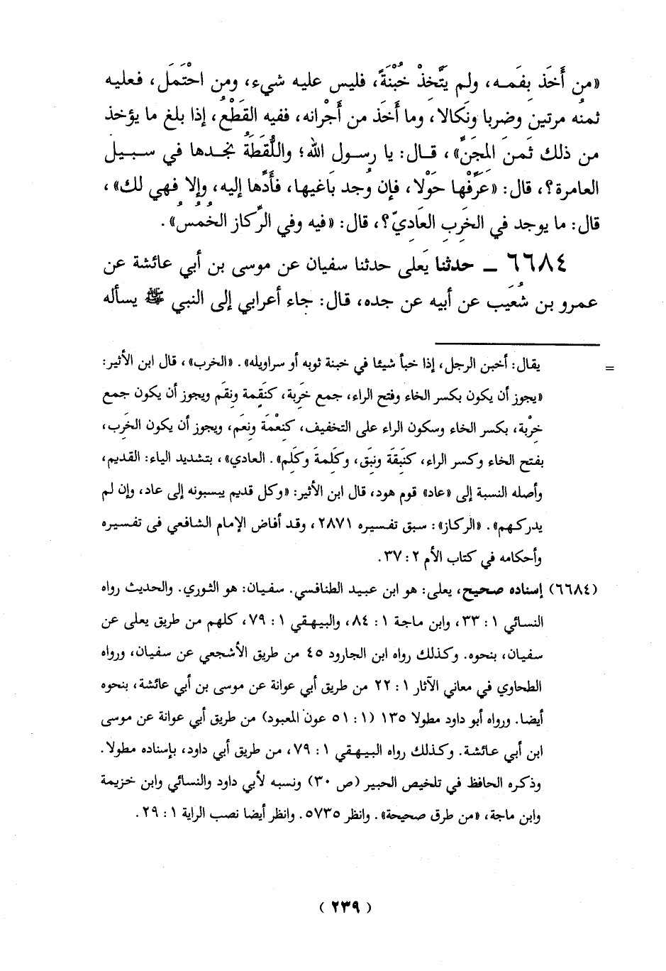 = يقال: أخبن الرجل، إذا خبأ شيئاً في خبنة ثوبه أو سراويله". "الخرب"، قال ابن الأثير: "يجوز أن يكون بكسر الخاء وفتح الراء، جمع خَربة، كنَقمة وِنقَم ويجوز أن يكون جمع خِرْبة، بكسر الخاء وسكون الراء على التخفيف، كنِعْمَة وِنعَم، ويجوز أن يكون الخَرِب، بفتح الخاء وكسر الراء، كنَبِقَة ونبِق، وكَلِمةَ وكَلِم". العادي"، بتشديد الياء: القديم، وأصله النسبة إلى "عاد" قوم هود، قال ابن الأثير: "وكل قديم يبسبونه إلى عاد، وإن لم يدركهم". "الركاز": سبق تفسيره 2871، وقد أفاض الإِمام الشافعي في تفسيره وأحكامه في كتاب الأم 2: 37.
